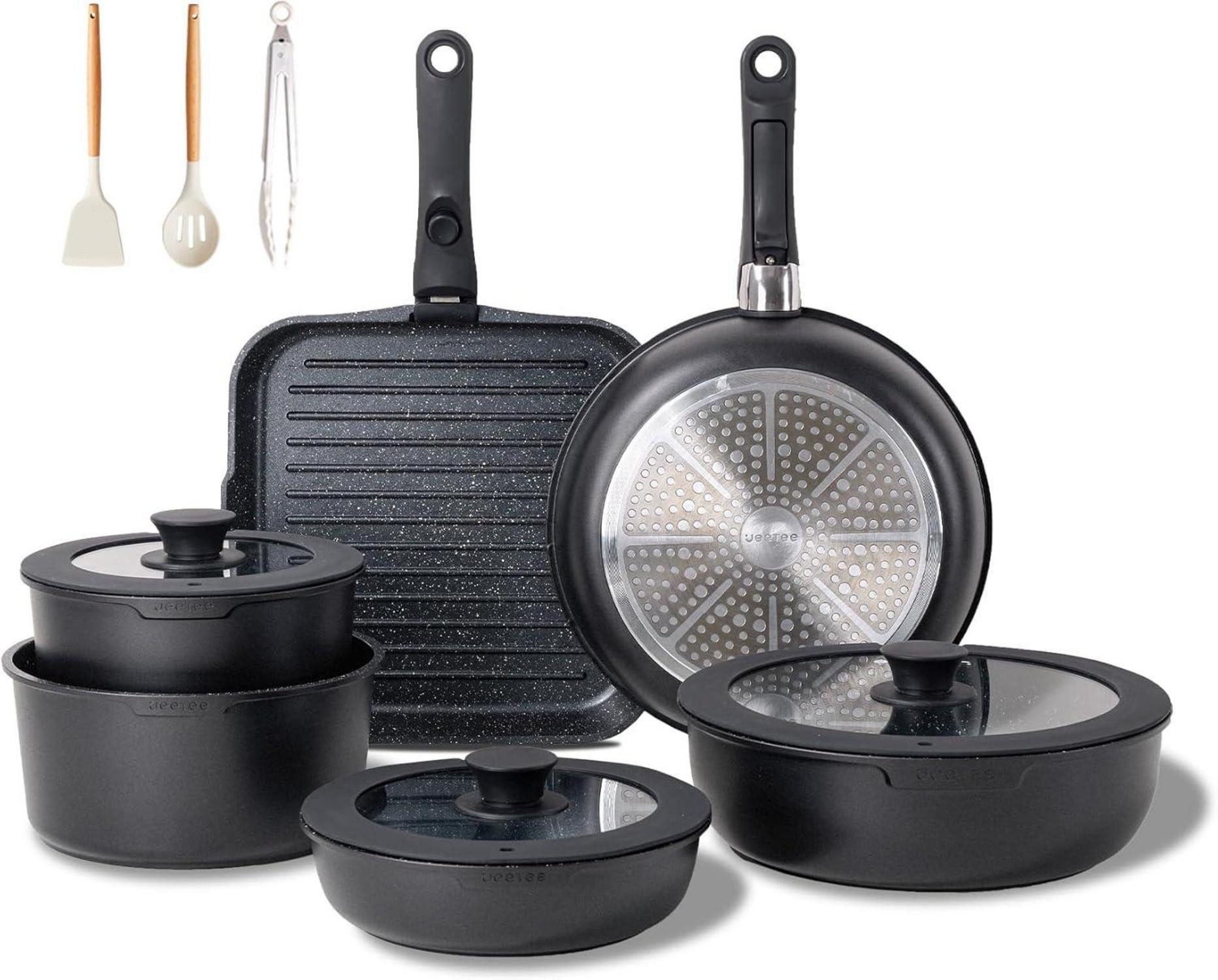 Die Antihaftbeschichtung sorgt dafür, dass Speisen nicht anbrennen und ermöglicht gesundes Kochen mit wenig Öl. Die Töpfe und Pfannen sind für alle Herdarten geeignet, einschließlich Induktion, und können bedenkenlos im Ofen verwendet werden. Der abnehmbare Griff macht die Handhabung einfach und ermöglicht eine platzsparende Aufbewahrung, da das gesamte Set stapelbar ist.