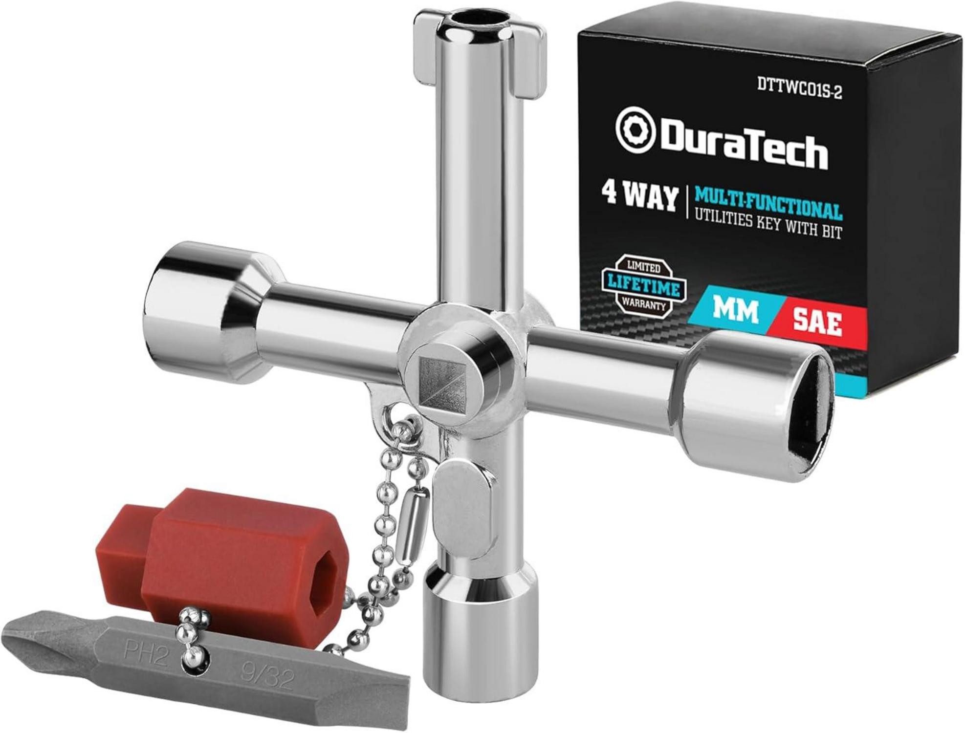 Der DURATECH 4 Wege Multifunktionale Utilities Schlüssel mit Bit ist ein vielseitiges Handwerkzeug, das speziell für Schaltschränke und Absperrsysteme in der Gas-, Wasser- und Stromversorgung entwickelt wurde. Mit einem Dreieckschlüssel, einem Kreisschlüssel, einem kleinen und einem großen quadratischen Schlüssel bietet dieser multifunktionale Schlüssel die Flexibilität, verschiedene Schrauben und Verschlüsse zu öffnen.