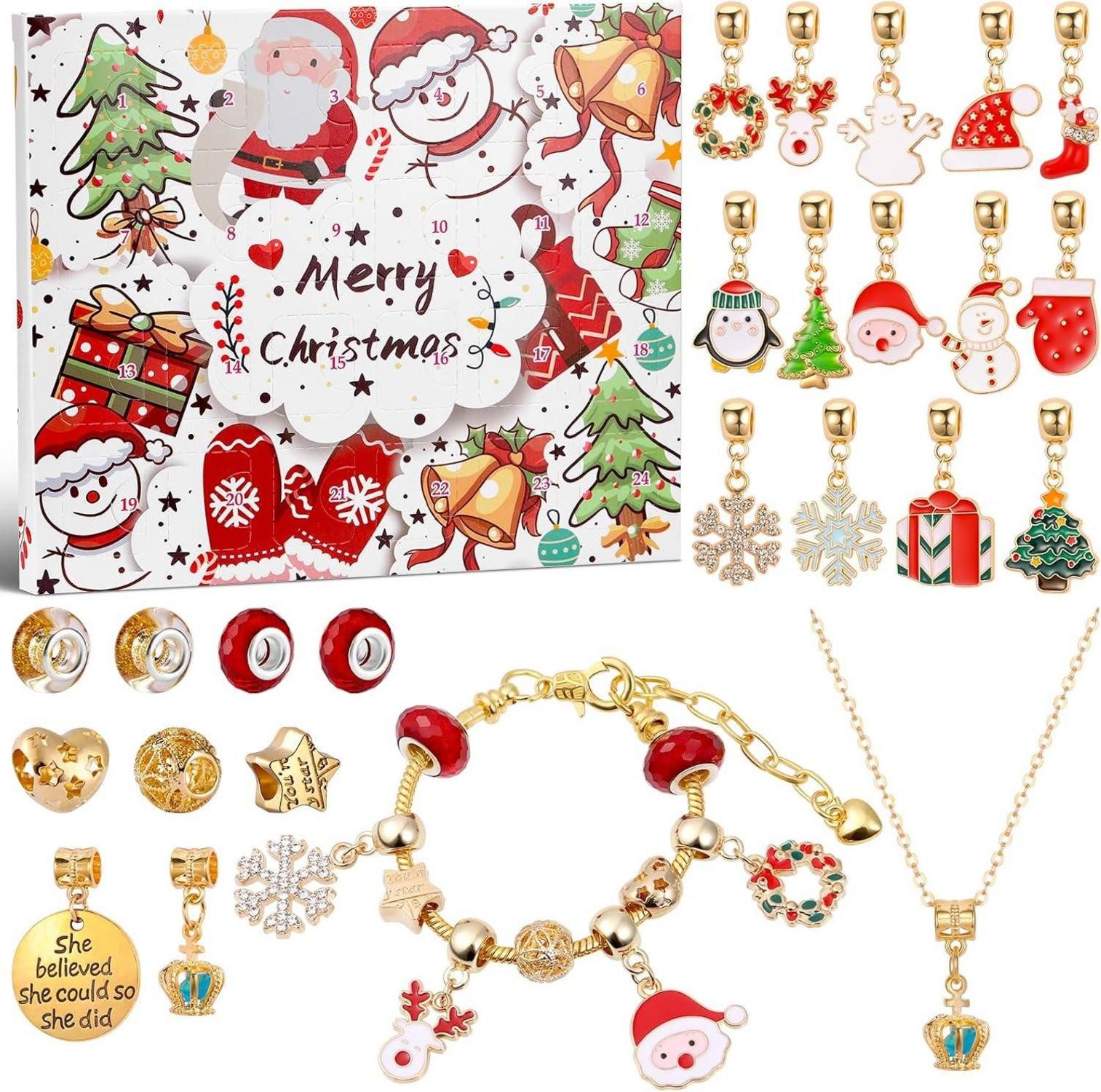 Dieser Yimomoyi Schmuck Adventskalender 2024 für Kinder ist ein zauberhafter Weg, die festliche Jahreszeit zu genießen. Jeden Tag vom 1. Dezember bis Heiligabend können Mädchen eine neue Tür öffnen und einen funkelnden Schmuck entdecken. Der Adventskalender enthält 23 unterschiedliche Charm-Perlen, ein verstellbares Armband (16–21.5cm) und eine verstellbare Halskette (46.5–52 cm), alles in einem bezaubernden Design mit Weihnachtsthemen wie Weihnachtsmann, Tannenbaum und mehr.