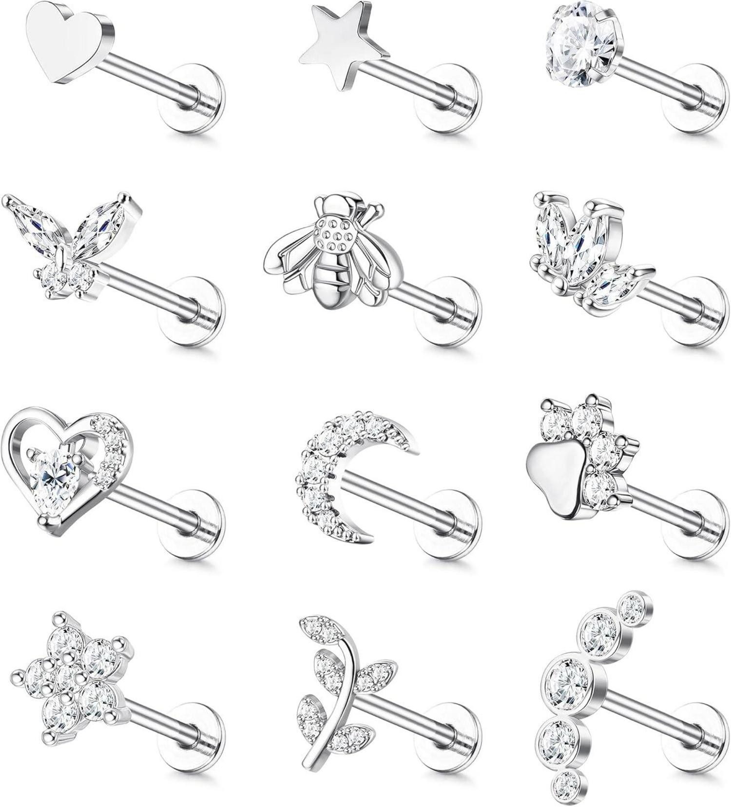 Das Set enthält 12 verschiedene Stile, darunter CZ Mond, Herz, Stern, Blatt und mehr, die für jeden Anlass geeignet sind. Mit einem Innengewinde-Design für einfaches Anbringen und einem glänzenden 5A+ Zirkonia-Finish sind diese Ohrringe ideal für Tragus, Helix, Conch und Nasenpiercings. Die Vielseitigkeit dieses Sets ermöglicht es Ihnen, Ihren Look nach Belieben anzupassen und neu zu definieren.