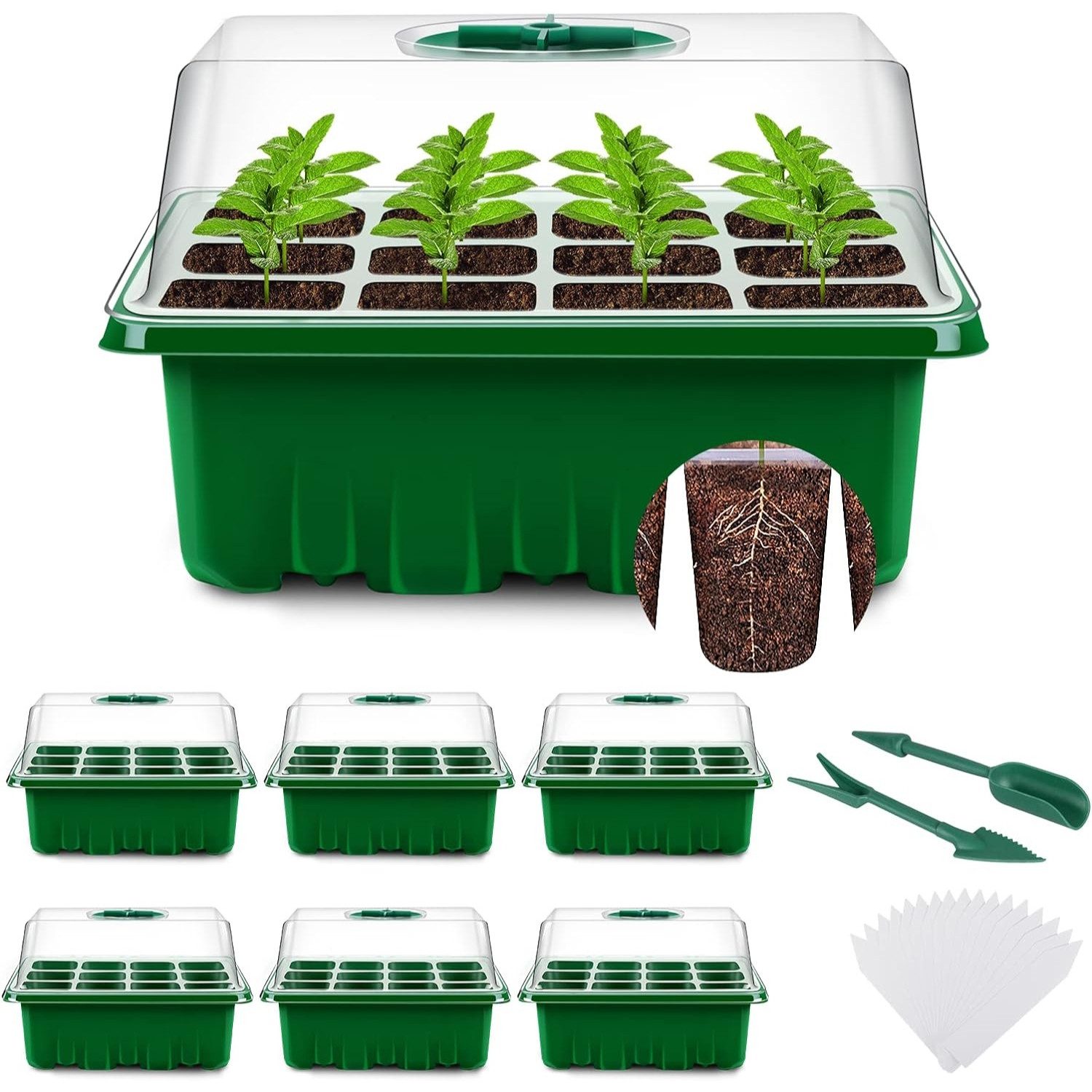 Dank des YAUNGEL Zimmergewächshauses Anzuchtkastens können Sie Ihre Pflanzenzucht in die eigenen Hände nehmen. Das Set umfasst 6 Anzuchtkästen mit insgesamt 72 Zellen, die perfekt für die Anzucht verschiedener Pflanzenarten wie Kräuter, Blumen, Salat, Obst, Gemüse und Stecklinge geeignet sind. Der verstellbare Deckel ermöglicht es, die Luftfeuchtigkeit individuell einzustellen, um optimale Wachstumsbedingungen zu schaffen. Die Anzuchtschalen bestehen aus robustem 0,8 mm PVC-Material, das langlebig, wiederverwendbar und bruchsicher ist. Dank der Abflusslöcher am Boden wird eine gute Drainage gewährleistet. Das Zimmergewächshaus ist auch kompatibel mit Heizmatten und Pflanzenlicht, sodass Sie Ihre Pflanzen auch unter speziellen Bedingungen gedeihen lassen können.Mit diesem Set erhalten Sie alles, was Sie benötigen, um sofort mit der Anzucht zu starten: 6 Saatschalen, 6 wasserdichte Bodenschalen, 6 Deckel mit verstellbarem Fenster, 20 Pflanzenetiketten und 2 kleine Gartengeräte. Das YAUNGEL Mini Gewächshaus ist die perfekte Wahl für Hobbygärtner und Einsteiger, um einen gesunden und blühenden Garten heranzuziehen.