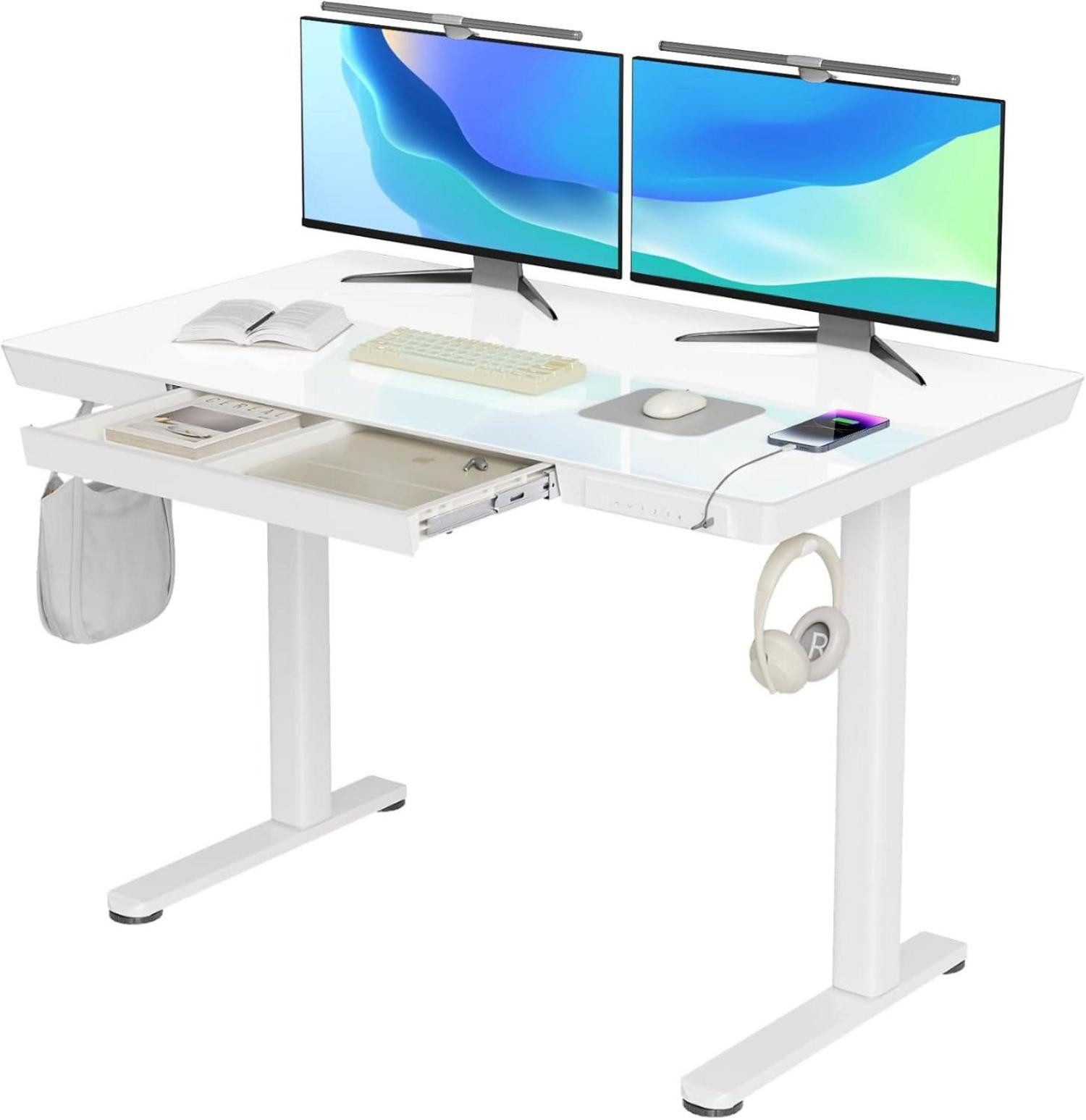 Der Claiks Glas Höhenverstellbarer Schreibtisch bietet Ihnen eine individuelle Kundenerfahrung mit vollem Vertrauen in die Qualität des Produkts. Unser höhenverstellbarer Schreibtisch mit einer Размер von 120x60 cm bietet ausreichend Arbeitsfläche und ein angenehmes Arbeitserlebnis. Die Tischplatte aus gehärtetem Glas verleiht dem Schreibtisch Eleganz und ist äußerst langlebig. Mit der integrierten Schublade können Sie Ihre Arbeitsfläche ordentlich halten und mehr Platz schaffen.Das multifunktionale Design mit USB-Anschlüssen und einem Typ-C-Anschluss ermöglicht es Ihnen, Ihre Geräte bequem aufzuladen, während Sie arbeiten. Der Schreibtisch ist elektrisch höhenverstellbar und verfügt über 4 voreingestellte Tasten, um die gewünschte Höhe einfach anzupassen.Genießen Sie die ergonomische Arbeitsumgebung, die durch den Claiks Glas Höhenverstellbaren Schreibtisch geschaffen wird. Dieser Schreibtisch ist das Ergebnis jahrelanger Forschung und Entwicklung, um Ihnen einen zuverlässigen und belastbaren Arbeitsplatz für zu Hause zu bieten. Mit einer Tragfähigkeit von bis zu 60 kg ist dieser Schreibtisch die perfekte Wahl für ein effizientes Arbeiten und ein komfortables Arbeitsumfeld.
