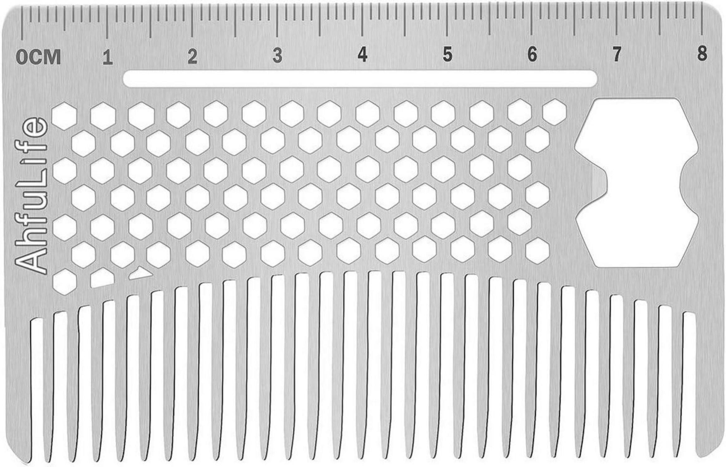 Der AhfuLife Metallkamm und Bartkamm im Kreditkartenformat ist ein Must-Have für jeden Mann, der sein Aussehen unterwegs perfektionieren möchte. Dieser schlanke und ultraleichte Kamm passt problemlos in Ihre Brieftasche und ist immer griffbereit, egal wo Sie sind.