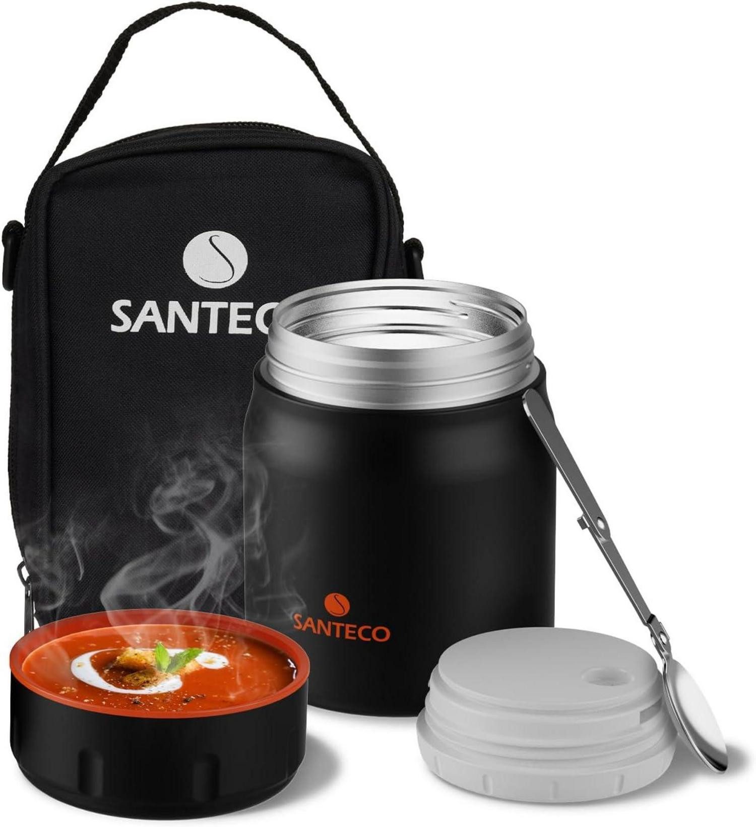 Der SANTECO Thermobehälter für Essen bietet eine optimale Lösung, um Ihre Speisen unterwegs frisch und in der gewünschten Temperatur zu halten. Vor dem Einfüllen von heißen Speisen einfach den Behälter mit heißem Wasser vorwärmen, oder für kalte Speisen im Kühlschrank abkühlen lassen. Der klappbare Löffel aus Edelstahl spart Platz und die mitgelieferte Tragetasche erleichtert den Transport. Der äußere Deckel kann sogar als Schüssel verwendet werden, was ihn besonders praktisch auf Reisen macht.