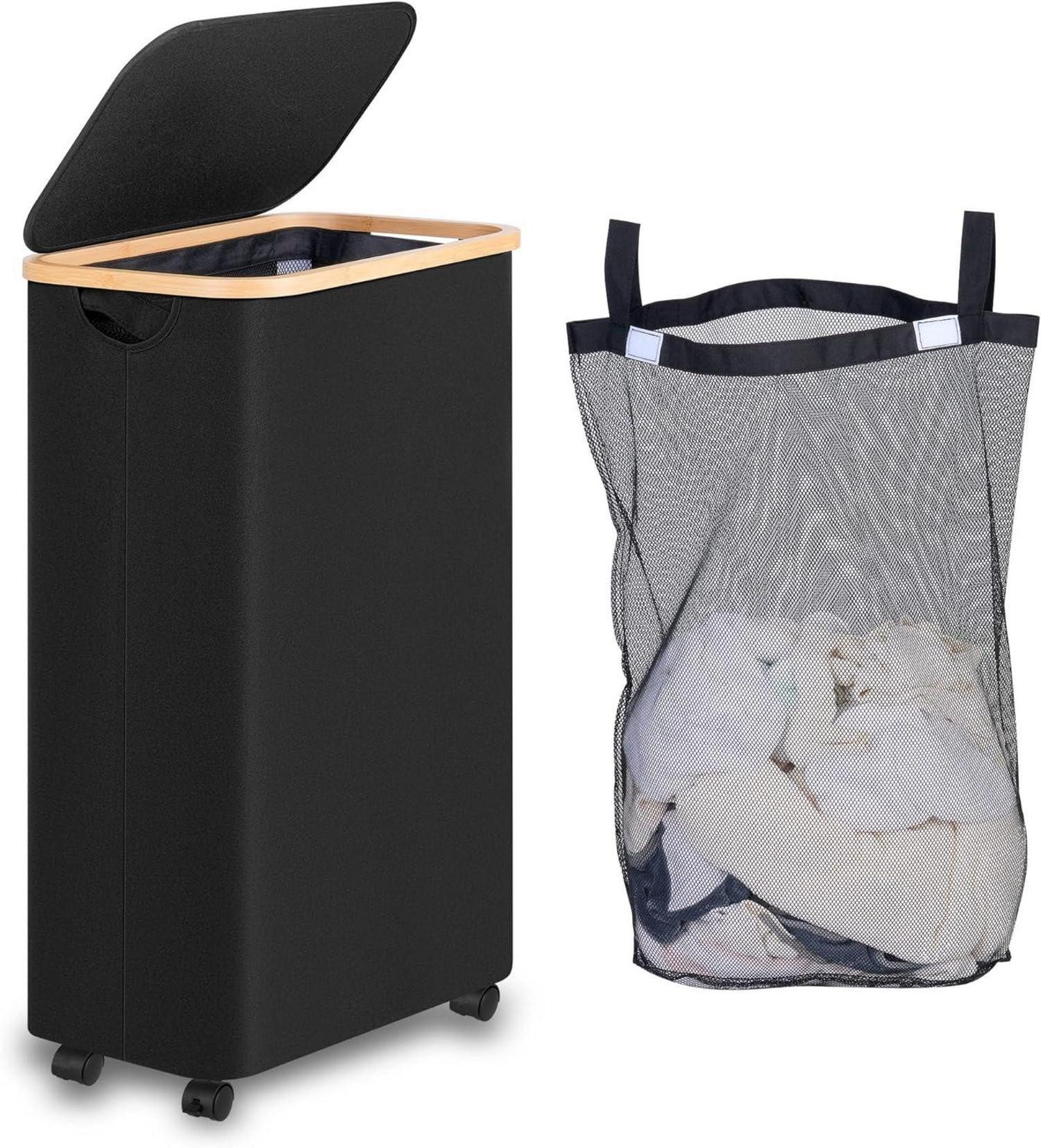 Die strapazierfähigen Bambusgriffe und der atmungsaktive Stoff sorgen für Langlebigkeit und leichte Reinigung. Der Wäschekorb lässt sich auf eine Höhe von nur 7,6 cm zusammenfalten und somit platzsparend verstauen. Mit einer Размер von 17,13 x 9,84 x 27,56 Zoll und praktischen Rollen ist dieser Wäschekorb ideal für den täglichen Gebrauch und schafft mehr Ordnung in Ihrem Zuhause.