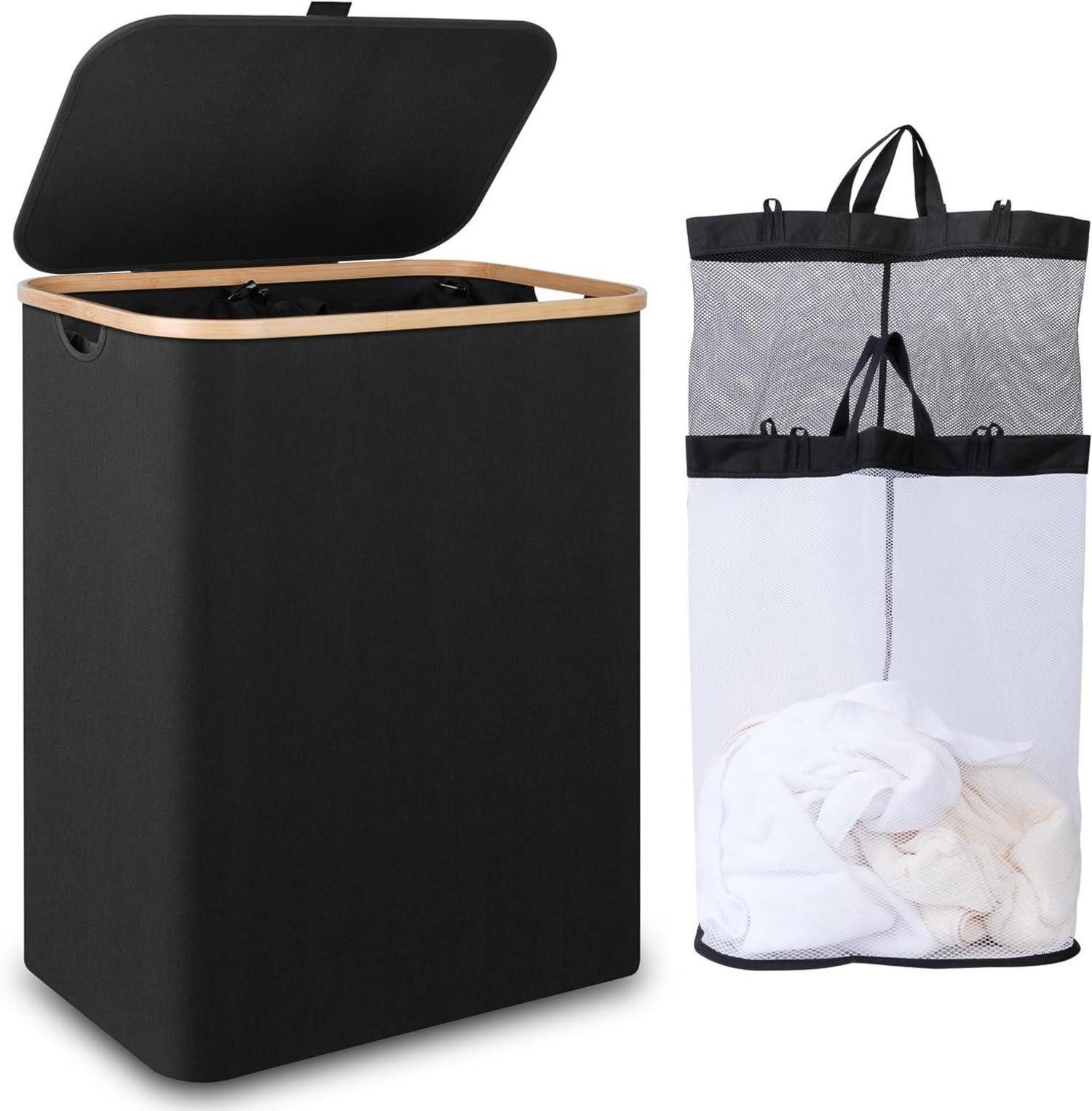 Das neuartige Design des Wäschekorbs passt perfekt in verschiedene Bereiche Ihres Hauses wie Schlafzimmer, Waschküche oder Bad. Dank der herausnehmbaren und waschbaren Innentaschen können Sie problemlos zwischen verschiedenen Wäschearten unterscheiden. Die robusten Materialien, darunter Oxford-Stoff und Bambusgriffe, gewährleisten Langlebigkeit und einfache Reinigung.