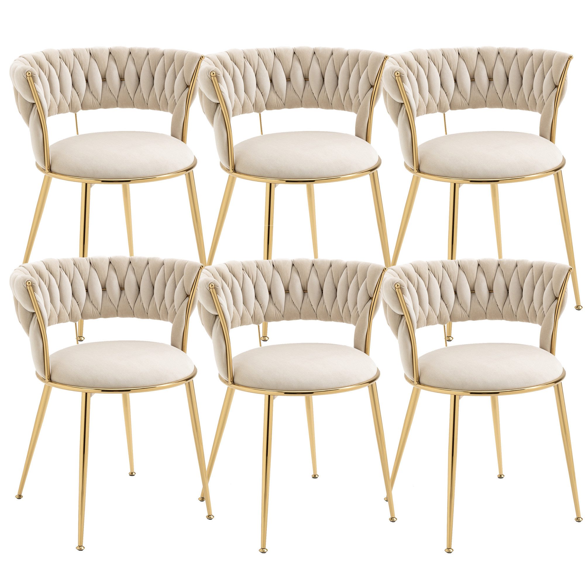 Dieses Set von 6 weichen Samt-Esszimmerstühlen ist der perfekte Begleiter für Ihr stilvolles Zuhause. Mit ihrer geschwungenen, fingerförmigen Rückenlehne und den zierlichen Armlehnen vereinen diese Stühle Luxus und Funktionalität auf harmonische Weise. Die moderne, hohle Rückenlehne verleiht den Stühlen eine leichte und luftige Ausstrahlung und sorgt gleichzeitig für eine optimale Belüftung.