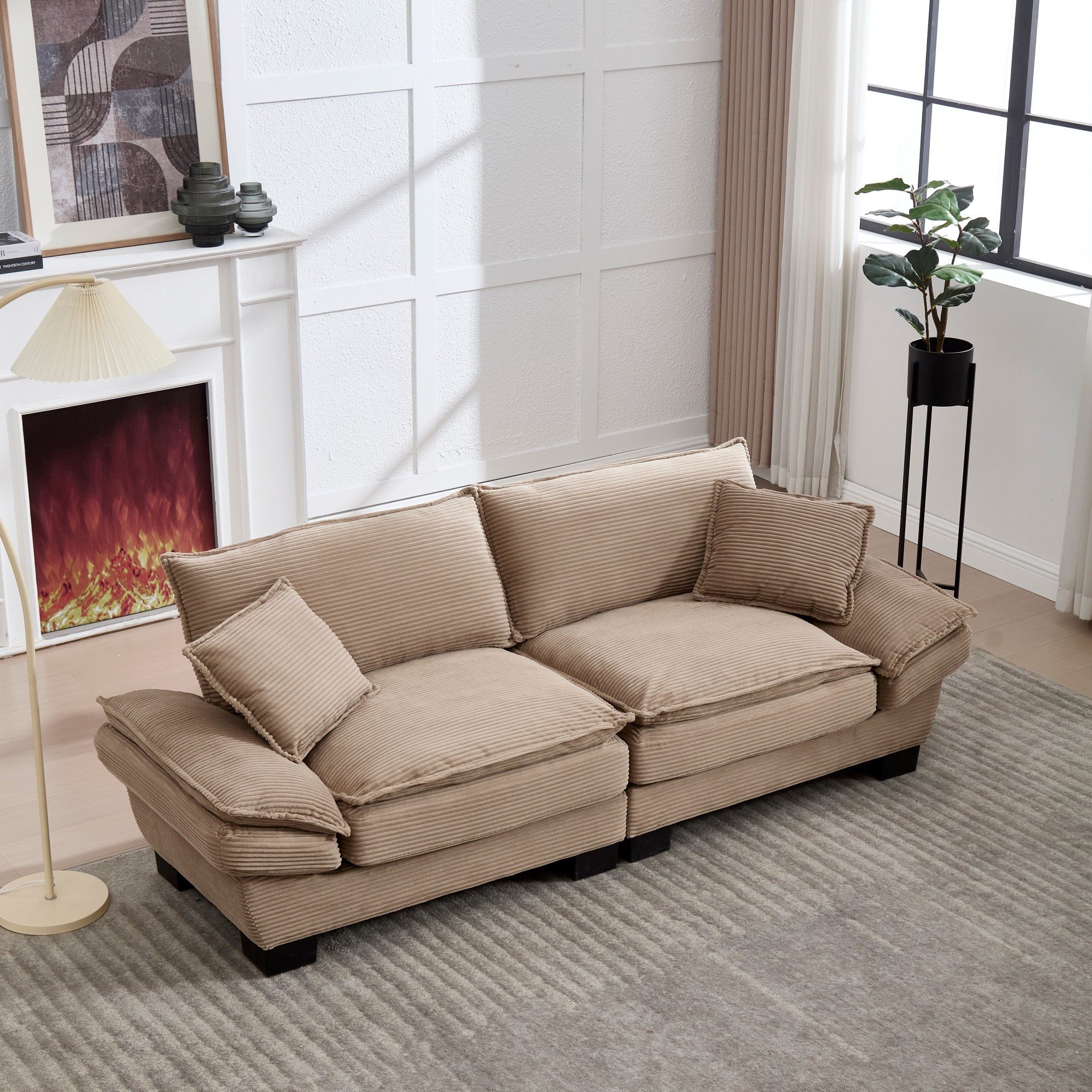Design: Tiefsitzsofa mit Samtbezug, breiten Armlehnen, 2 Zusatzkissen, zweigeteilte Polsterung