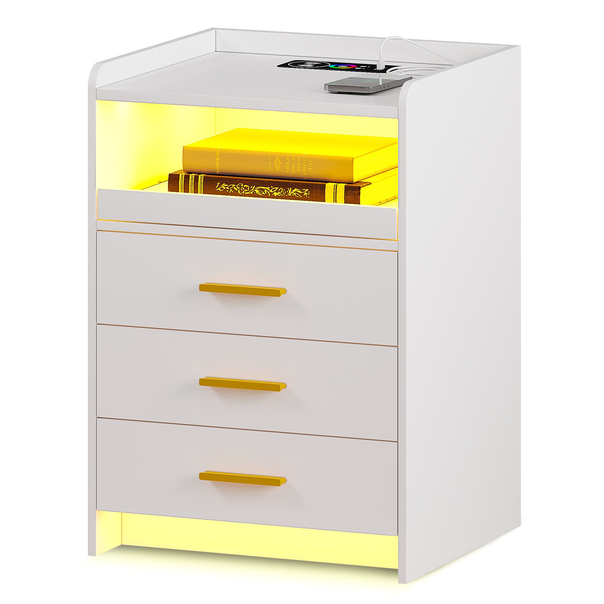 Moderner Nachttisch mit 24-farbigem LED-Licht, kabelloser Ladestation und großem Stauraum. Perfekt für Schlafzimmer oder Wohnzimmer.