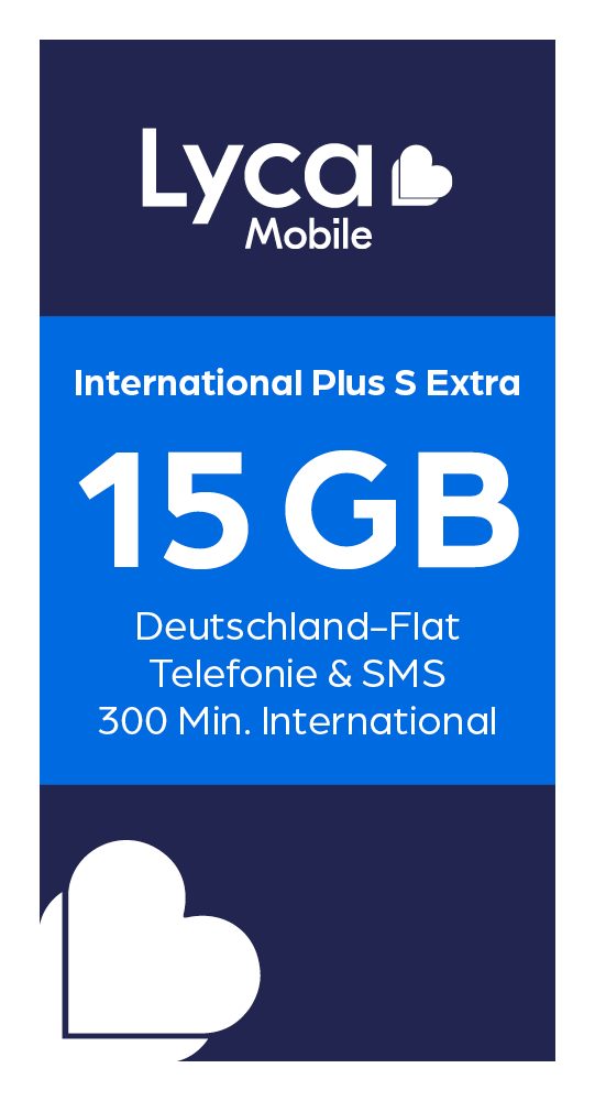 Egal, ob Kanada, Brasilien oder Australien, mit dem Prepaid-Tarif Lyca International Plus S Extra kannst Du jeden Monat 300 Minuten in 100 Länder telefonieren – und das ganz ohne Zusatzkosten. Gleichzeitig bekommst Du eine Deutschland-Flat für Telefonie und SMS sowie 15 GB Datenvolumen pro Monat. Lyca International Plus S Extra kostet Dich für 4 Wochen nur 14,99 . Hier die wichtigsten Details des Tarifs: - 15 GB Datenvolumen/Monat – mit bis zu 50 Mbit/s - 15 GB EU Roaming/Monat - 300 internationale Minuten in 100 Länder - Telefonie Flat in alle deutschen Netze - SMS-Flat in alle deutschen Netze - Keine Mindestvertragslaufzeit - 14,99 für 4 Wochen