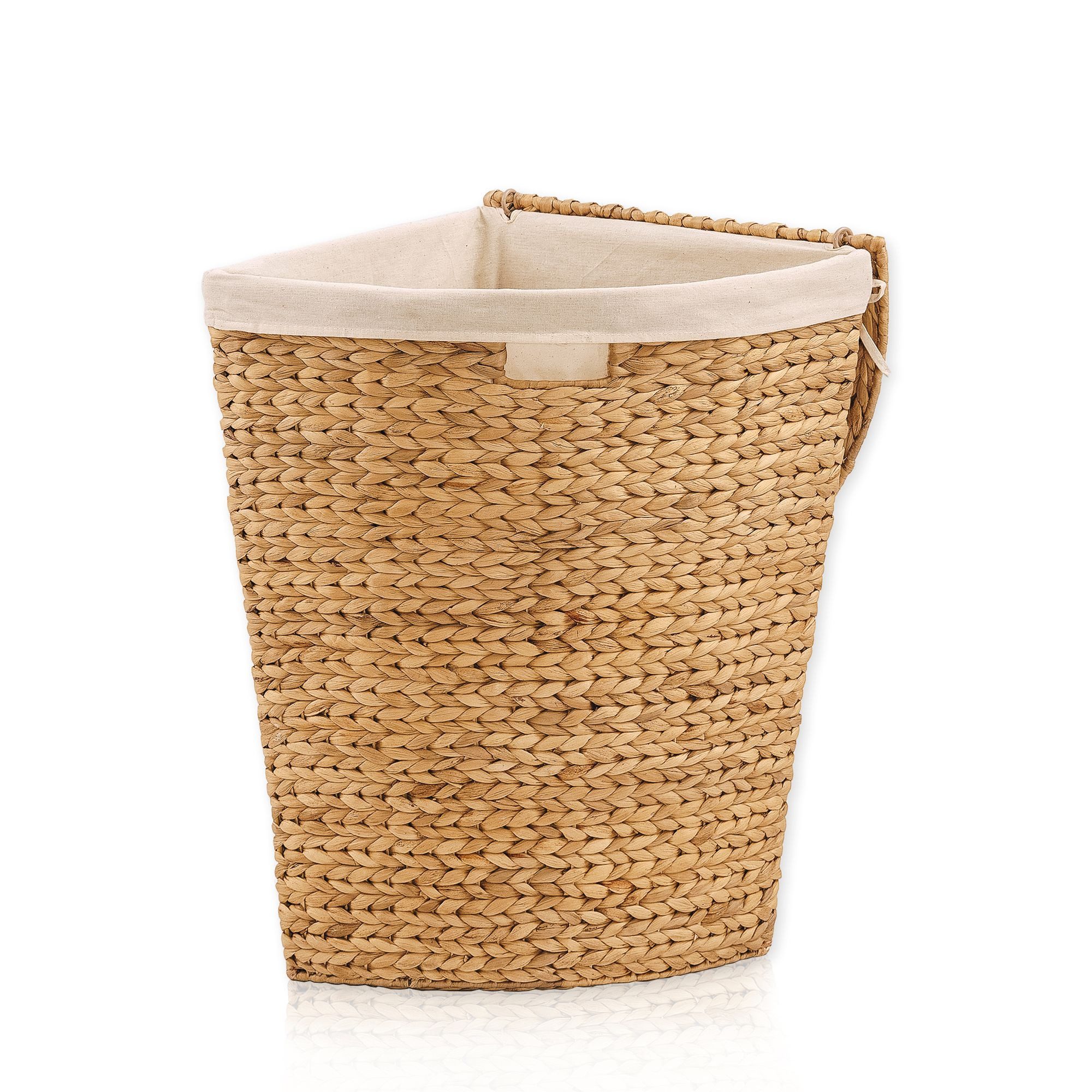 Unser Wäschekorb mit Deckel hat einen herausnehmbaren Wäschesack aus Baumwolle, dieser ist bei 30° Schon- oder Handwäsche waschbar. Die Wäschebox eignet sich ideal zum Aufbewahren von Wäsche, Bettwäsche, Handtüchern, Spielzeug uvm. Der Eckwäschekorb schafft Stauraum in Nischen und passt durch seine Form ideal an Ecken mit wenig Platz. Durch ihre natürliche, schlichte Optik passt die Wäschetonne aus Wasserhyazinthe in jedes Raumambiente und schafft Wärme und Gemütlichkeit. Aufgrund ihrer hochwertigen Verarbeitung ist sie stabil und langlebig. Der Deckel lässt sich einfach aufklappen, aber nicht vollständig abnehmen. Wasserhyazinthe ist ein natürlich nachwachsender Rohstoff. Bitte beachte, dass Wasserhyazinthe in Verbindung mit Feuchtigkeit zur Stockbildung neigen kann. Daher solltest du keine feuchte oder gar nasse Kleidung dauerhaft in dem Wäschekorb aufbewahren.