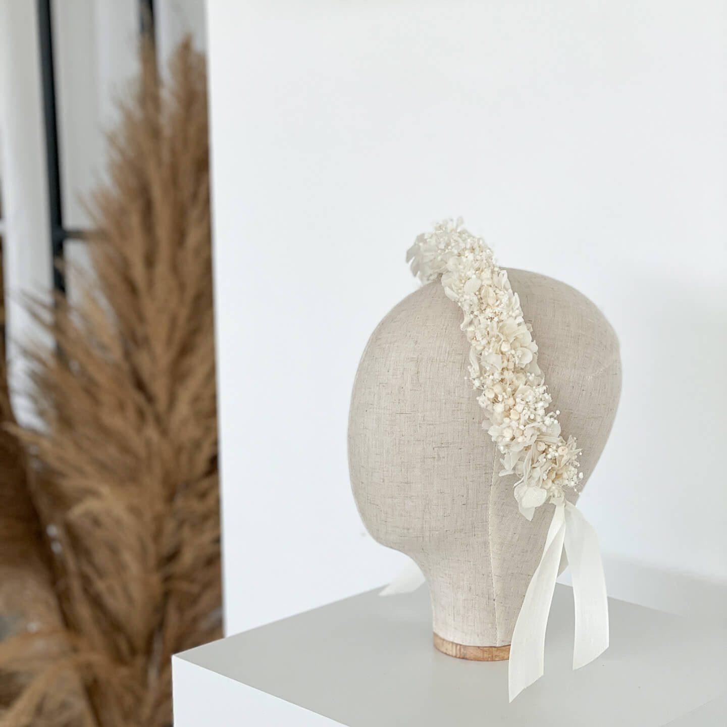 Ein Haarkranz aus Trockenblumen für die Ewigkeit aus Hortensie, Schleierkraut und Yizilda. Schlicht und doch mit viel Liebe zum Detail durch unsere exklusiv ausgewählten Trockenblumen. Unsere Haarkränze aus Trockenblumen sind ein absolutes Highlight, auch bekannt als Flowercrown, Trockenblumenhaarband, Blumenkranz und vieles mehr. Die zarten und filigranen Trockenblumen in weiß sind schön sommerlich und passen zu einer lockeren Hochzeit oder JGA mit Trockenblumen. Der schlichte Haarkranz mit weißen Trockenblumen passt auch perfekt für Blumenmädchen oder als Haarband zur Kommunion. Auf der Suche nach einem minimalistischen Trockenblumenkranz bist du bei uns an der richtigen Stelle, wir haben verschiedene tolle Вариантыn für dich online.