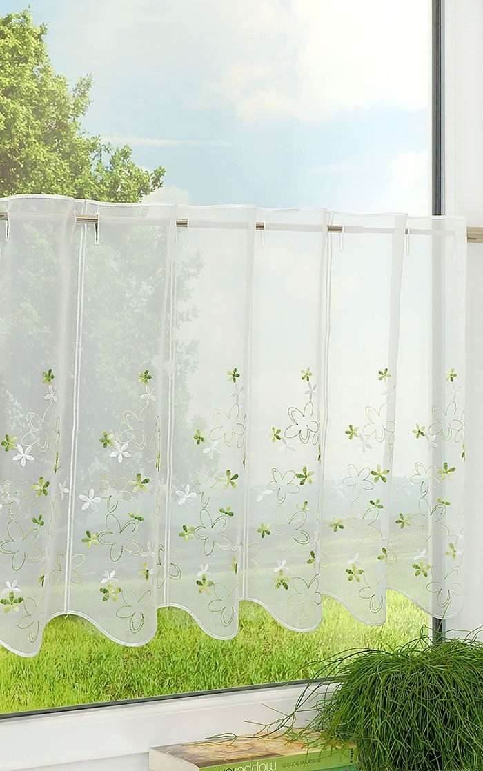 Ein sanftes und natürliches Muster schmückt diese Scheibengardine, die als Meterware mit einer Mindest-Segmentbreite von 16 cm auf Ihre Bedürfnisse zugeschnitten werden kann. Die angebotenen Maße ermöglichen leichten Sichtschutz auf Augenhöhe. Das Design basiert auf durchsichtigem, weißem Polyester, der effektvoll mit einfallendem Tageslicht spielen kann und den Blick in die freie Natur unverstellt lässt. Innerhalb der Segmente finden sich kunstvoll gestickte Blümchen, welche, sporadisch verteilt, natürlich und zart wirken, dabei aber auch eine verspielte Note ins Muster bringen. Der obere Saum ist gerade geschnitten und beinhaltet die rechteckig umrandeten Cut Outs für den Stabdurchzug. Der untere Saum verläuft sanft geschwungen und unterstreicht die schöne Weichheit dieser Scheibengardine. Der pflegefreundliche Stoff passt gut in klassische wie moderne Wohnzimmer, in Küchen und Esszimmer, ist aber auch eine Bereicherung für das Reich Ihrer Kinder..