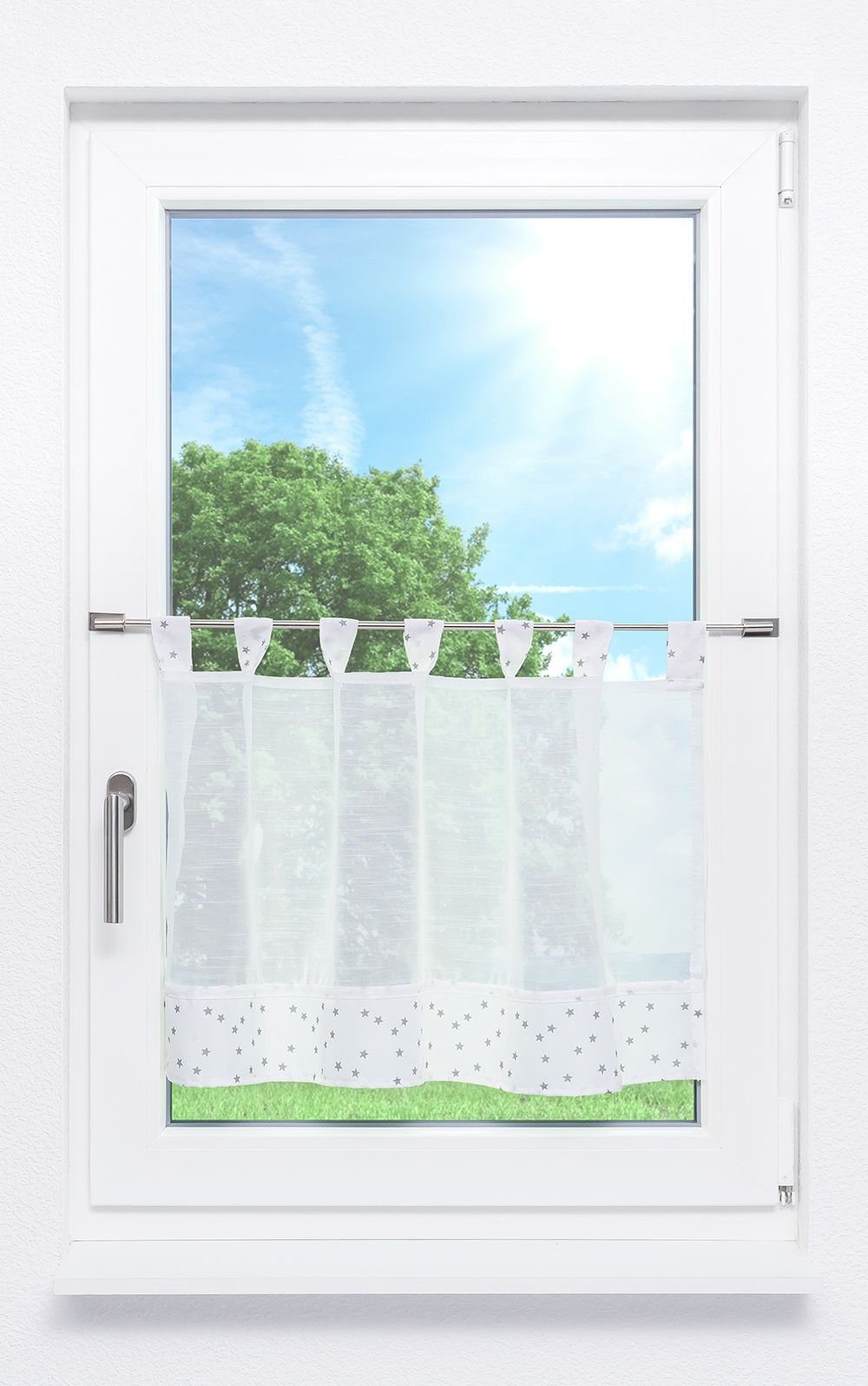 Eine Scheibengardine, welche oben und unten mit einem hübschen Sternendekor verziert, dazwischen aber neutral gehalten ist, bekommen Sie mit diesem Modell. Das Grundmaterial besteht aus 100 % transparentem Polyesterstoff, was eine effektvolle, leichte und luftige Dekoration ermöglicht. Der Blick ins Freie bleibt unverstellt, die Sichtmöglichkeit von außen ins Zimmer aufgrund der Gardinenhöhe zumindest tagsüber leicht eingeschränkt. Klassisch gerade geschnitten, erfolgt die Befestigung mittels Stangendurchzug. Die dazugehörigen Schlaufen am oberen Rand fügen sich harmonisch in das Gesamtbild ein. Das Modell ist in verschiedenen Größen erhältlich. Schonend reinigen lässt sich die Gardine bequem mit der Waschmaschine bei 30 °C...