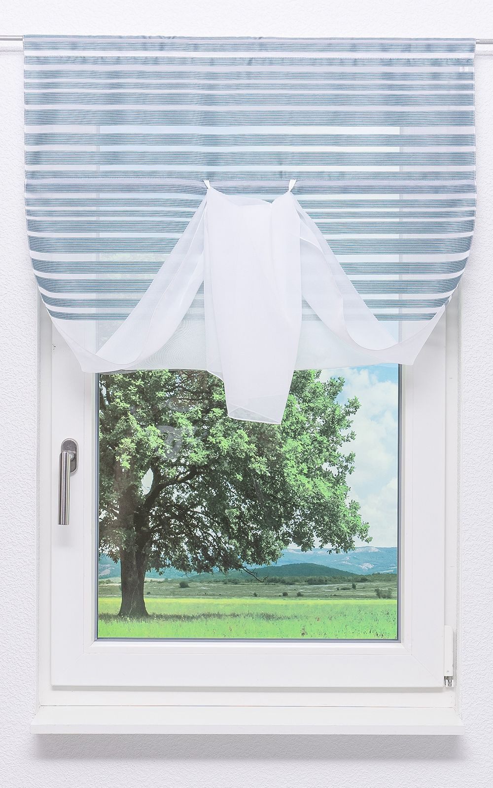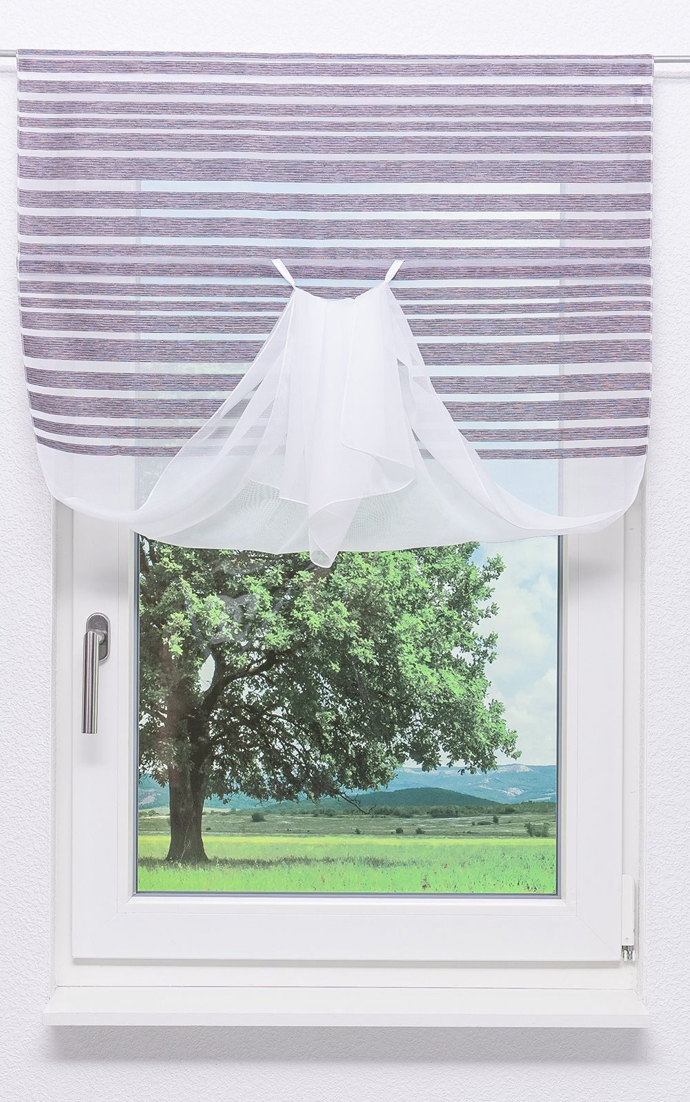 Raffinierter geht es kaum, und das im wahrsten Sinne des Wortes. Denn dieser Scheibenhänger kann Ihr Fenster nicht nur dekorativ schmücken, sondern dazu auch noch attraktiv gerafft werden. Ein mittig eingearbeitetes Schleifenband übernimmt diese Aufgabe. Ebenfalls mehr als nur einen Blick wert ist die klassische Musterung im oberen Bereich der Gardine. Farbige Streifen, horizontal und leicht strukturiert, stehen im hübschen Kontrast zum weißen Grundmaterial, welches die untere Hälfte des Stoffes ausmacht. Dieser besteht aus 100 % Polyester, lässt durch seine Transparenz viel Licht in den Raum und stimmungsvolle Effekte entstehen. Wohnzimmer und Küchen wirken mit diesem Fensterschmuck optisch größer, freundlich und offen. Über den Tunnelzug lässt sich der bereits fensterfertig konfektionierte Scheibenhänger schnell und einfach auf eine Gardinenstange ziehen. Eine Auswahl verschiedener Modelle finden Sie als Zubehör bei uns. Der mitgelieferte Beschwerungsstab gewährleistet einen schönen Fall. Zu den positiven Eigenschaften des Behanges gehört nicht zuletzt ein hübscher Saum und seine Pflegefreundlichkeit. Zum Reinigen stellen Sie den Schonwaschgang der Maschine und eine Temperatur von 30 °C ein..