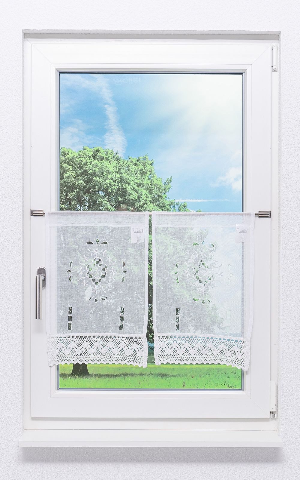 Mit diesem Set bleibt Sie flexibel bei der Fensterdekoration und haben vielfältige kreative Möglichkeiten. Es besteht aus zwei weißen Scheibengardinen, die Sie je nach Bedarf auch einzeln vor die Glasfront platzieren können. Durch eine Stange gezogen, lässt sich der Stoff jederzeit bequem öffnen und schließen. Der Fensterschmuck wirkt auf den ersten Blick schlicht, offenbart bei näherem Hinsehen aber eine geheimnisvolle Eleganz, die sich in Einrichtungen im Landhausstil besonders zu Hause fühlt. Das Design besteht aus fantasievollen Cut Outs, filigranen Spitzenverzierungen und einem hübschen Saum am unteren Abschluss. Die Halbtransparenz des Polyestergewebes lässt genug Sonnenlicht ins Zimmer, um eine helle und freundliche Atmosphäre zu schaffen und bietet dabei einen guten Sicht- und Sonnenschutz. Am Abend sind bei eingeschaltetem Licht in der Wohnung von außen Konturen der Einrichtung und Bewegungen erkennbar. Wenn es um die Farbwahl geht, ist Weiß ein beliebter Klassiker, um Räumen mehr Helligkeit, Frische und eine zeitlose Schönheit zu verleihen. Kleinere Räume mit wenig natürlichem Lichteinfall können von den Scheibengardinen profitieren. Das Gewebe kann mit der Maschine gewaschen werden, schonend bei 30 °C...