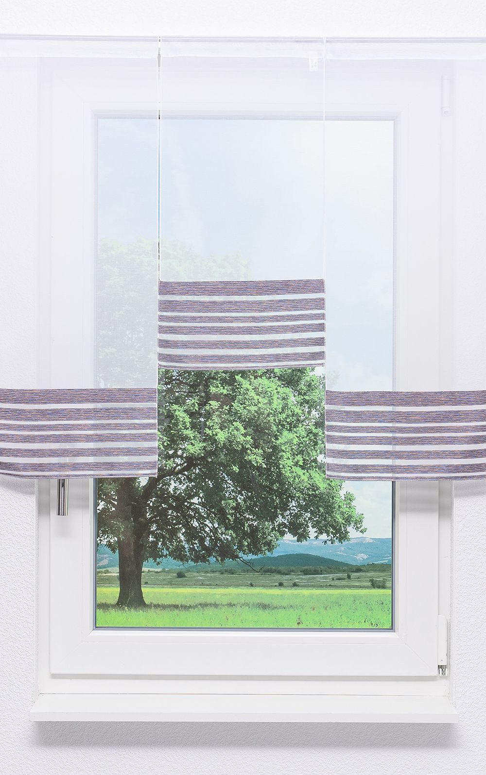 Mit diesem Set haben Sie viele kreative Möglichkeiten. Es besteht aus drei transparenten Scheibenhängern, die im unteren Bereich mit einem gefälligen und leicht strukturierten Streifenmuster verziert sind. Im Vergleich zum größeren Teil des Stoffes, der in neutralem Weiß gehalten ist, bildet das farbige Design einen schönen Kontrast. Sie bekommen die Gardinen in zwei verschiedenen Длинаn. In welcher Reihenfolge Sie diese an der Glasfront platzieren, bleibt Ihrer Kreativität überlassen. Gesäumte Seiten tragen zum dekorativen Erscheinungsbild am Fenster bei, ebenso die Beschwerungsstäbe, welche für einen akkuraten Fall der Hänger zuständig sind. Da diese über einen Tunnel verfügen, kann die Gardinenstange einfach und bequem durch den oberen Abschluss geschoben werden. Die Transparenz des Polyesters gewährleistet, dass die Umgebung des Fensters hell, offen und großzügig wirkt. Der Ausblick ins Freie wird von der Gardine nicht versperrt, und es entsteht eine freundliche Atmosphäre, welcher es gelingt, die Welt vor dem Fenster mit der dahinter harmonisch zu vereinen. Leichten Sichtschutz am Tage dürfen Sie ebenfalls erwarten. Für die Reinigung der Deko empfiehlt sich der Schonwaschgang bei 30 °C..