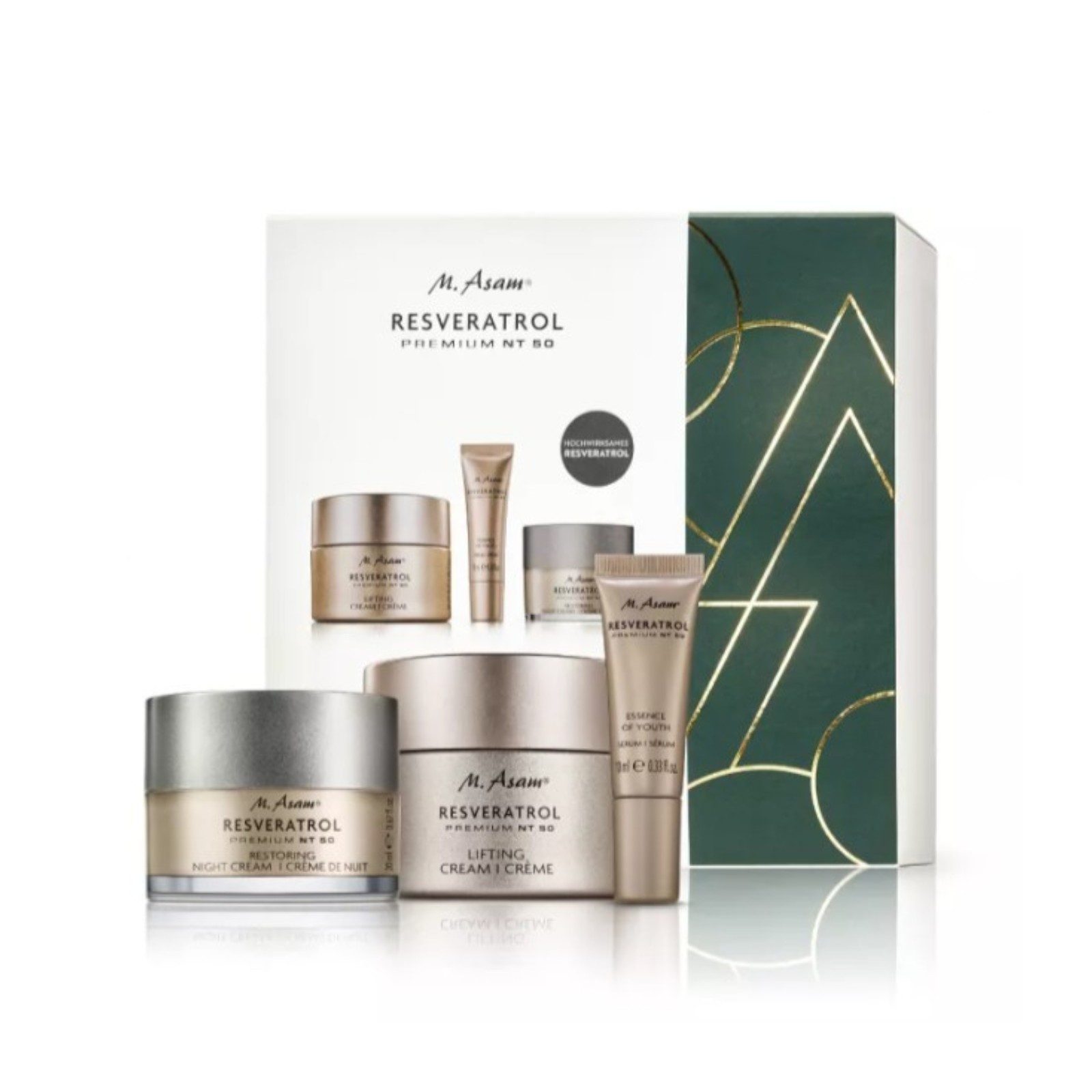 Lieferumfang | M. Asam RESVERATROL PREMIUM NT50 Restoring Night Cream (20 ml) M. Asam RESVERATROL PREMIUM NT50 Lifting Creme (50 ml) M. Asam RESVERATROL PREMIUM NT50 Essence of Youth (10 ml) |