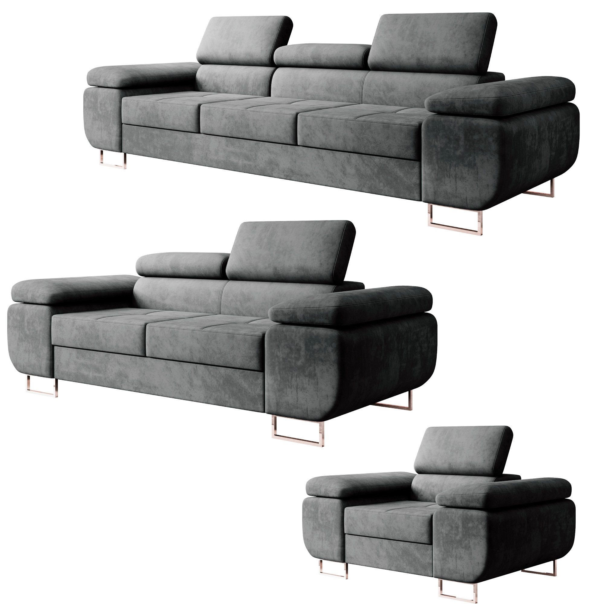 Polstergarnitur Miami 3-2-1 Samtstoff Grau Anthrazit mit Bett Kopfteilverstellung Bett Sofa Schlafsofa Wohnlandschaft
