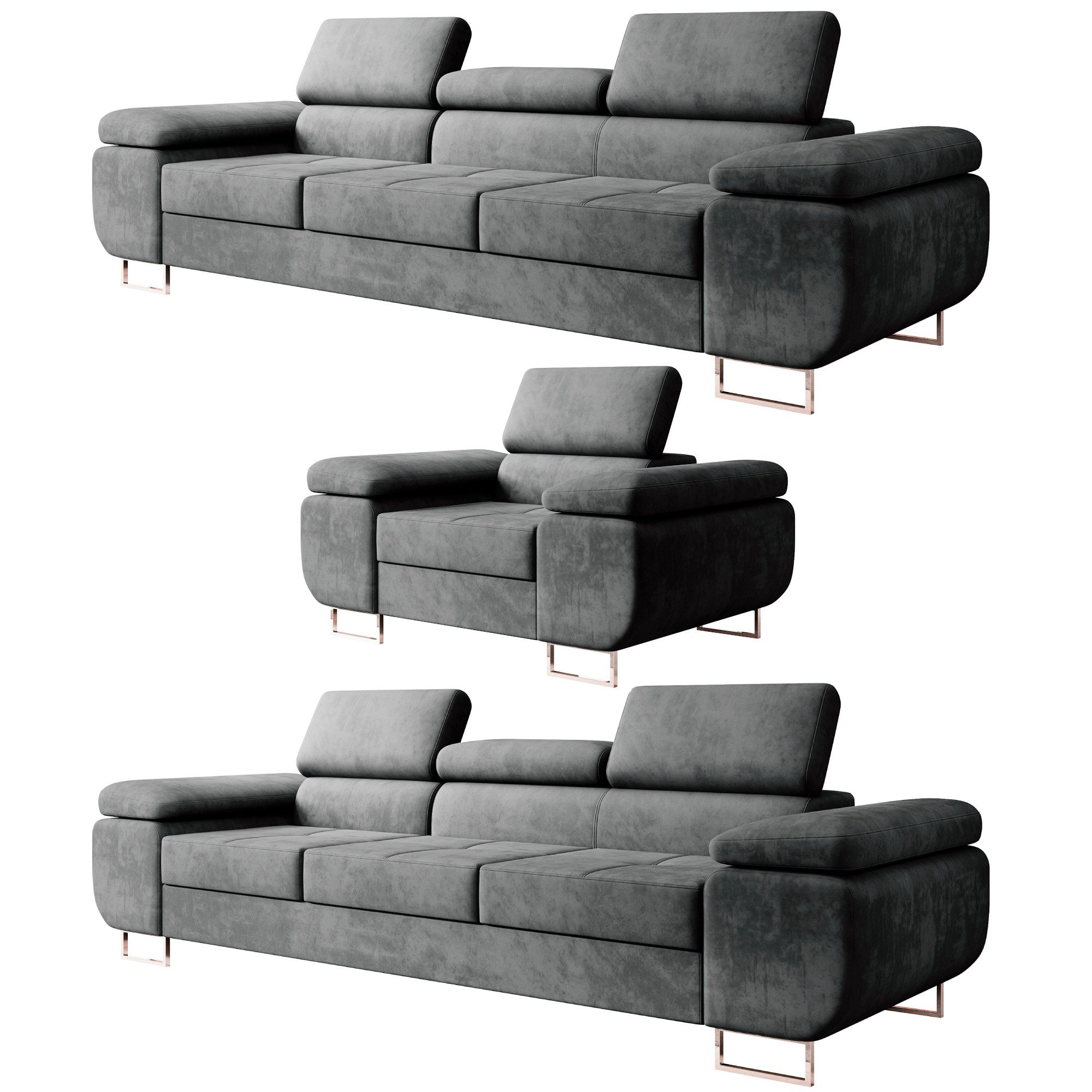 Polstergarnitur Miami 3-3-1 Samtstoff Grau Anthrazit mit Bett Kopfteilverstellung Bett Sofa Schlafsofa Wohnlandschaft