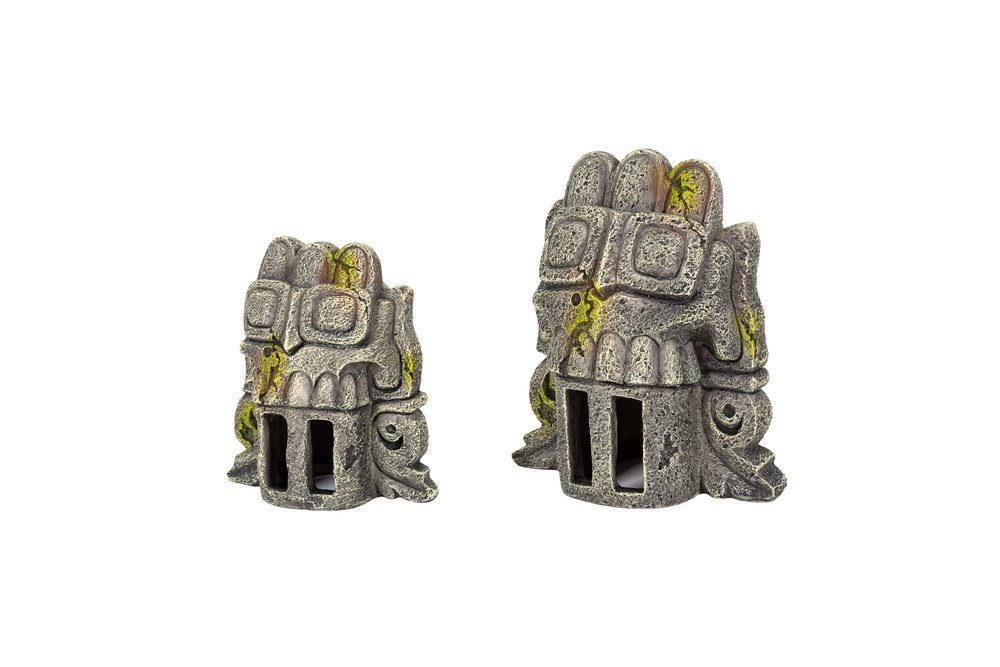 ReptiZoo Deko-Steinstatue mit der Abbildung eines Gesichts.  Auf der Rückseite befindet sich ein Einstieg, mit der die Statue auch als kleine Höhle genutzt werden kann.  Entweder von noch sehr jungen Königspythons in der Anfangszeit oder kleineren Natterarten Einstieg Rückseite:  Oval  von 5x3 cm; Öffnung Vorderseite: 2 Rechtecke von je 1x4 cm      Grundfläche Höhle innen: Oval 6,5x4 cm  Gesamtmaße: ca. 12x10x15cm  (BxTxH)