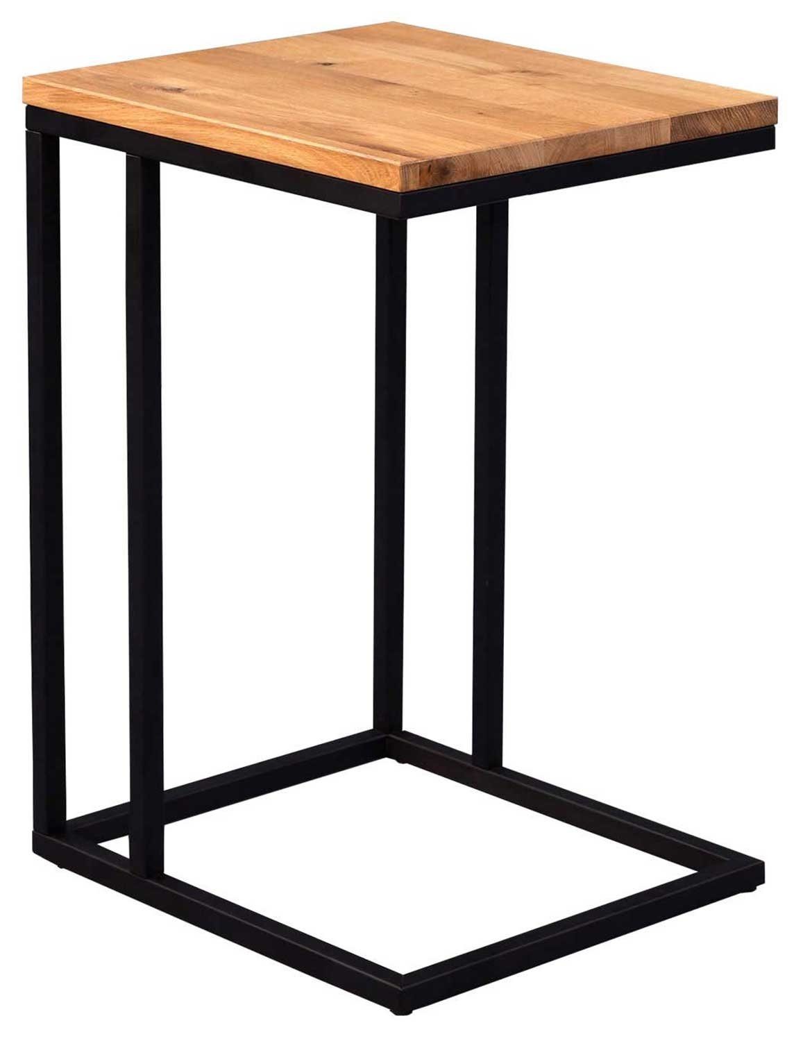 Der M2 Beistelltisch "NICK" bietet eine stilvolle und funktionale Ergänzung für Ihr Zuhause. Hergestellt aus massiver Wildeiche und mit einem geölten Finish, verleiht die Tischplatte dem Raum eine natürliche und warme Note. Das Gestell aus schwarzem Metall sorgt für Stabilität und Kontrast zur Holzoberfläche.