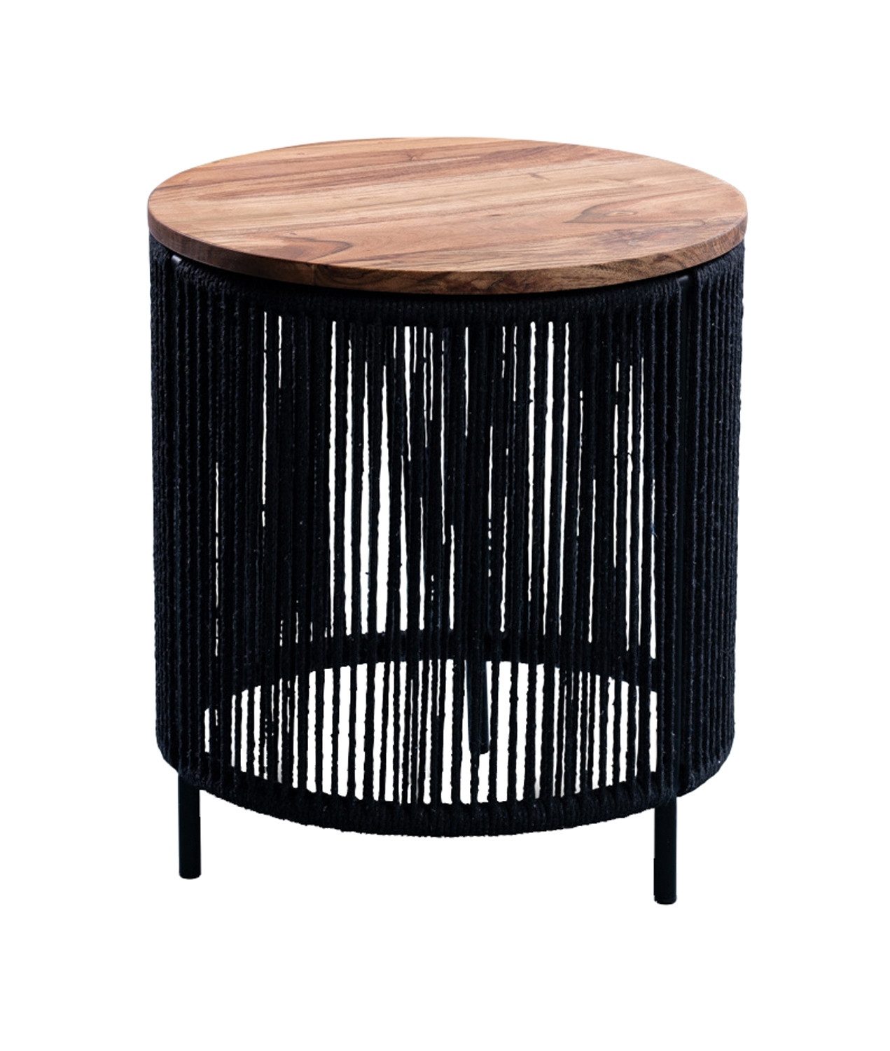 Der Beistelltisch SIMON von M2 ist ein charmanter Akzent für jedes Wohnzimmer. Seine Tischplatte aus massivem Akazienholz verleiht ihm eine natürliche und rustikale Note, während das schwarze Metallgestell Stabilität und Modernität bietet. Die Seitenbespannung aus schwarzen Kordeln verleiht dem Tisch eine interessante Textur und ein einzigartiges Aussehen. Mit ausreichend Platz für Fernbedienungen und Zeitschriften ist er nicht nur ein Blickfang, sondern auch praktisch. Mit einem Durchmesser von 40 cm und einer Höhe von 45 cm passt er ideal in verschiedenste Wohnbereiche und schafft eine gemütliche Atmosphäre.