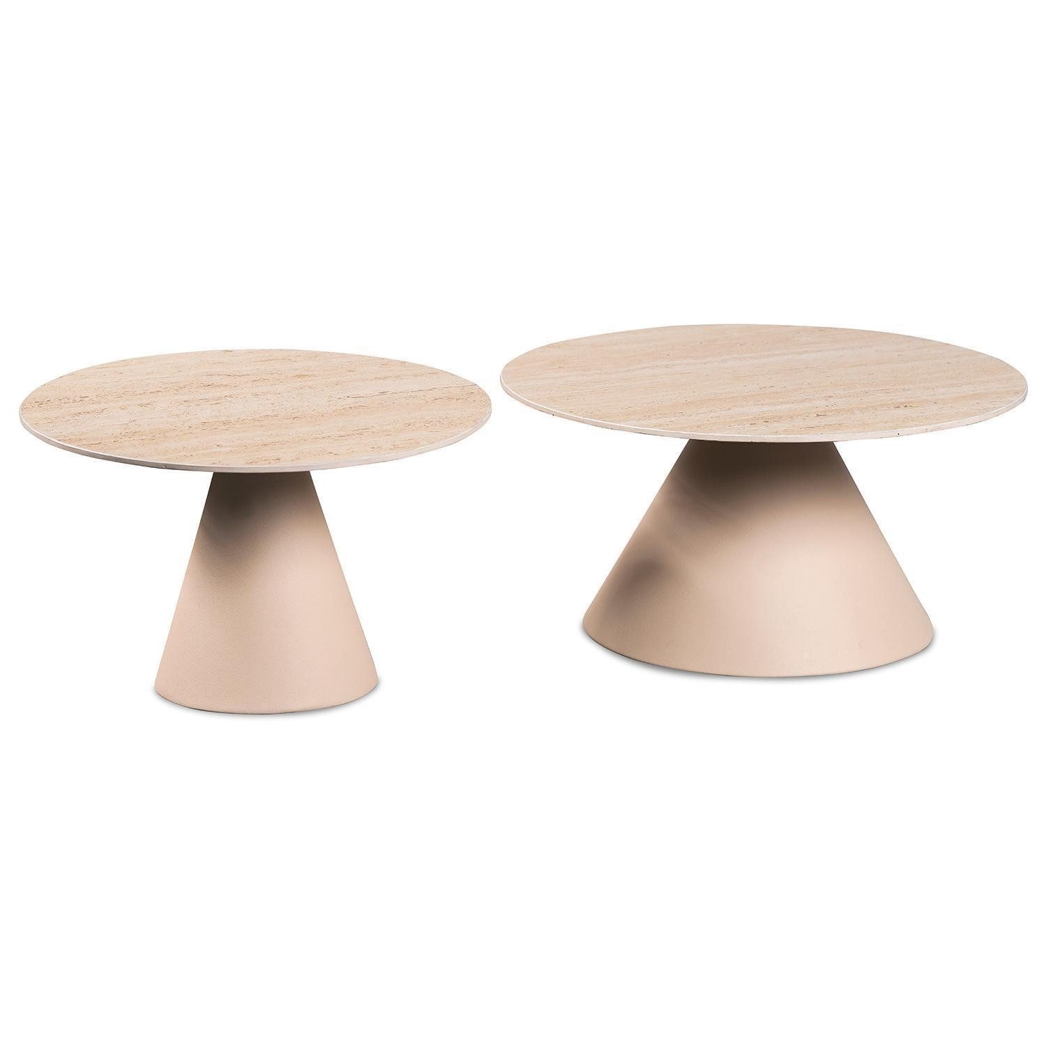 Das 2-teilige Couchtisch-Set SVEN der Marke M2 besteht aus zwei Tischen in unterschiedlichen Größen. Die Tischplatten sind aus Keramik gefertigt und haben eine helle Travertinoptik, während die Gestelle aus Metall in Cremeweiß bestehen. Die Kombination aus unterschiedlichen Tischgrößen ermöglicht eine flexible Platzierung im Wohnbereich.
