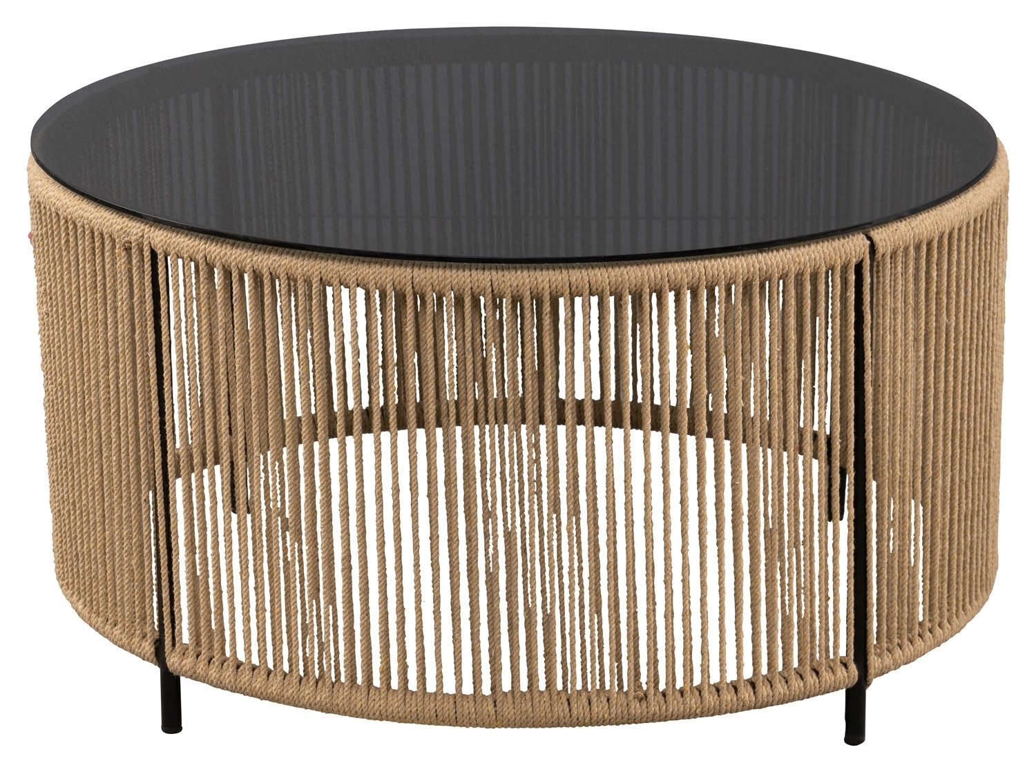Der Couchtisch SIMON von M2 ist ein charmanter Akzent für jedes Wohnzimmer. Seine Tischplatte aus schwarzem Sicherheitsglas verleiht ihm eine natürliche und rustikale Note, während das schwarze Metallgestell Stabilität und Modernität bietet. Die Seitenbespannung aus braunen Kordeln verleiht dem Tisch eine interessante Textur und ein einzigartiges Aussehen. Mit ausreichend Platz für Fernbedienungen und Zeitschriften ist er nicht nur ein Blickfang, sondern auch praktisch. Mit einem Durchmesser von 75 cm und einer Höhe von 40 cm passt er ideal in verschiedenste Wohnbereiche und schafft eine gemütliche Atmosphäre.