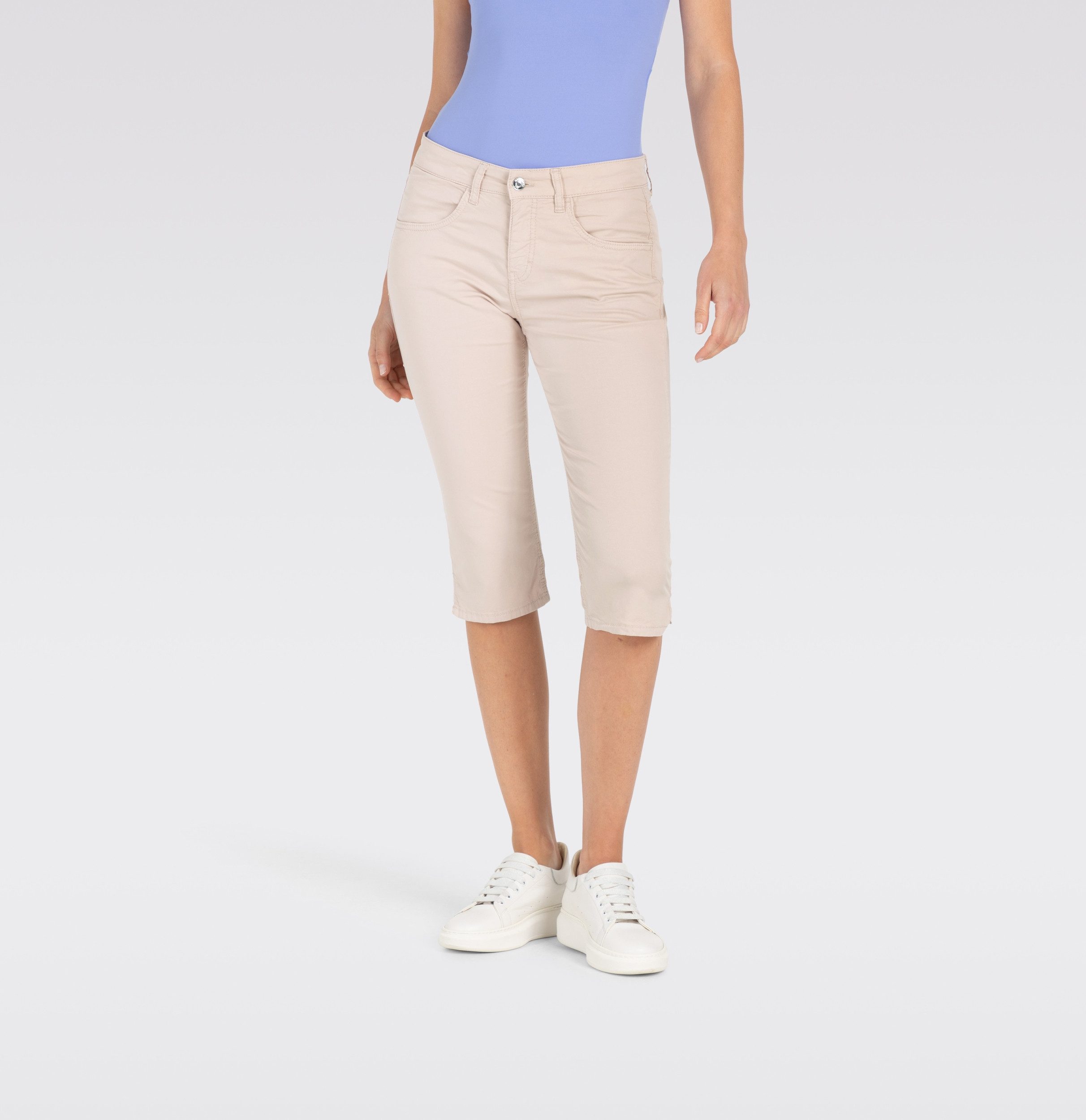 Caprihose, Slim Fit, schmale Passform, normale Leibhöhe, Five Pocket, feiner Schlitz am Saum, hochwertiger, elastischer Baumwoll-Gabardine, leicht im Gewicht, weicher Griff, hervorragendes Rücksprung-Verhalten, hoher Tragekomfort, über Better Cotton gesourcte Baumwolle, Das Model ist 1,75m groß und trägt die MAC Hosengröße 36, Beinabschluss bei Размер 36: 36cm