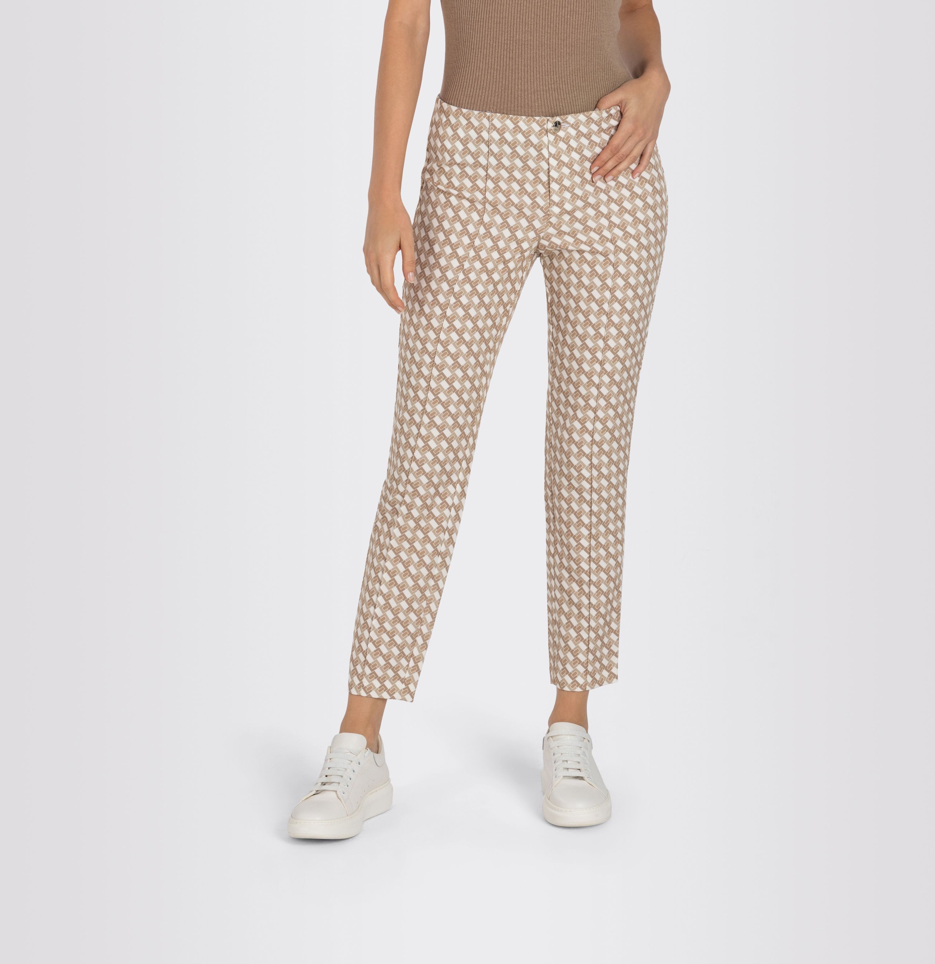Slim Fit, Slim Leg, schmales, gerades Bein, verkürzte Длина, etwas erhöhte Leibhöhe, bequeme Taille, modernes, sommerliches Muster, technische Bi-Stretch-Qualität, knitterfrei, hervorragendes Rücksprung-Verhalten, hoher Tragekomfort, weich im Griff, pflegeleicht, businesstauglich, Made in Italy, Das Model ist 1,75m groß und trägt die MAC Hosengröße 36, Fußweite bei Размер 36: 29cm