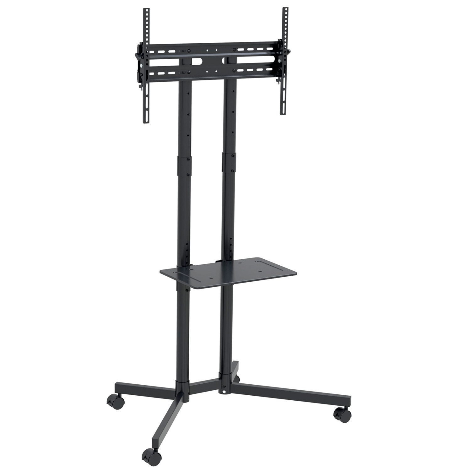 Der Ständer zeichnet sich durch sein praktisches Design, eine sehr einfache Montage und eine sehr breite Palette von Fernsehern aus, die wir darauf montieren können. Die eingebaute verstellbare untere Ablage ermöglicht die Montage von optionalem Zubehör wie DVDs, Verstärkern, Tablets, Laptops, Konsolen usw. Der Ständer ist außerdem mit vier Rollen ausgestattet, dank derer Sie das gesamte Set leicht an jeden beliebigen Ort bewegen können. Die für eine ordnungsgemäße Installation erforderlichen Schrauben und eine bebilderte Installationsanleitung sind im Lieferumfang enthalten. Ideal für Konferenzräume, Flughäfen, öffentliche Ausstellungen oder andere professionelle Präsentationen.