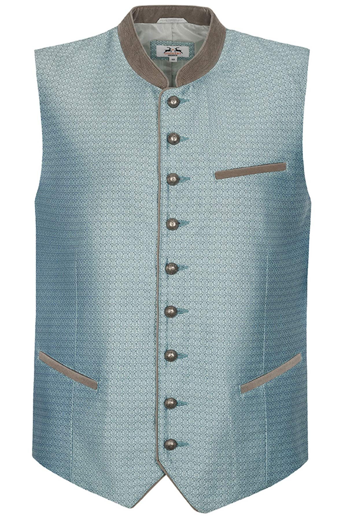 Diese stilvolle Trachtenweste in der frischen Farbe Türkis vereint traditionelle Eleganz mit modernem Charme. Ihr hochwertiges Material sorgt für einen angenehmen Tragekomfort und macht sie zur perfekten Wahl für festliche Anlässe, Volksfeste oder besondere Feierlichkeiten. Das feine, leicht gemusterte Obermaterial auf der Vorderseite verleiht der Weste eine edle Optik, während die dezent abgestimmten Knöpfe einen klassischen Trachtenstil unterstreichen. Der elegante Stehkragen mit kontrastierendem Besatz hebt sich stilvoll vom Hauptstoff ab und verleiht der Weste einen authentischen, traditionellen Look. Die zwei seitlichen Leistentaschen und eine zusätzliche Brusttasche bieten Platz für kleine Accessoires und sind mit farblich passenden Paspeln versehen, die das Gesamtbild abrunden. Die Rückseite aus hochwertigem Leinen sorgt für eine optimale Luftzirkulation und erhöht den Tragekomfort, besonders an wärmeren Tagen. Dank eines verstellbaren Riegels am Rücken kann die Passform individuell angepasst werden, sodass die Weste stets perfekt sitzt. Sie lässt sich ideal mit einer klassischen Trachtenhose oder einer modernen Jeans kombinieren und ist ein echter Hingucker bei jedem Anlass. Ob auf dem Oktoberfest, einer Hochzeit oder einem stilvollen Abendessen – diese Trachtenweste unterstreicht den traditionellen Stil mit einer frischen, modischen Note.