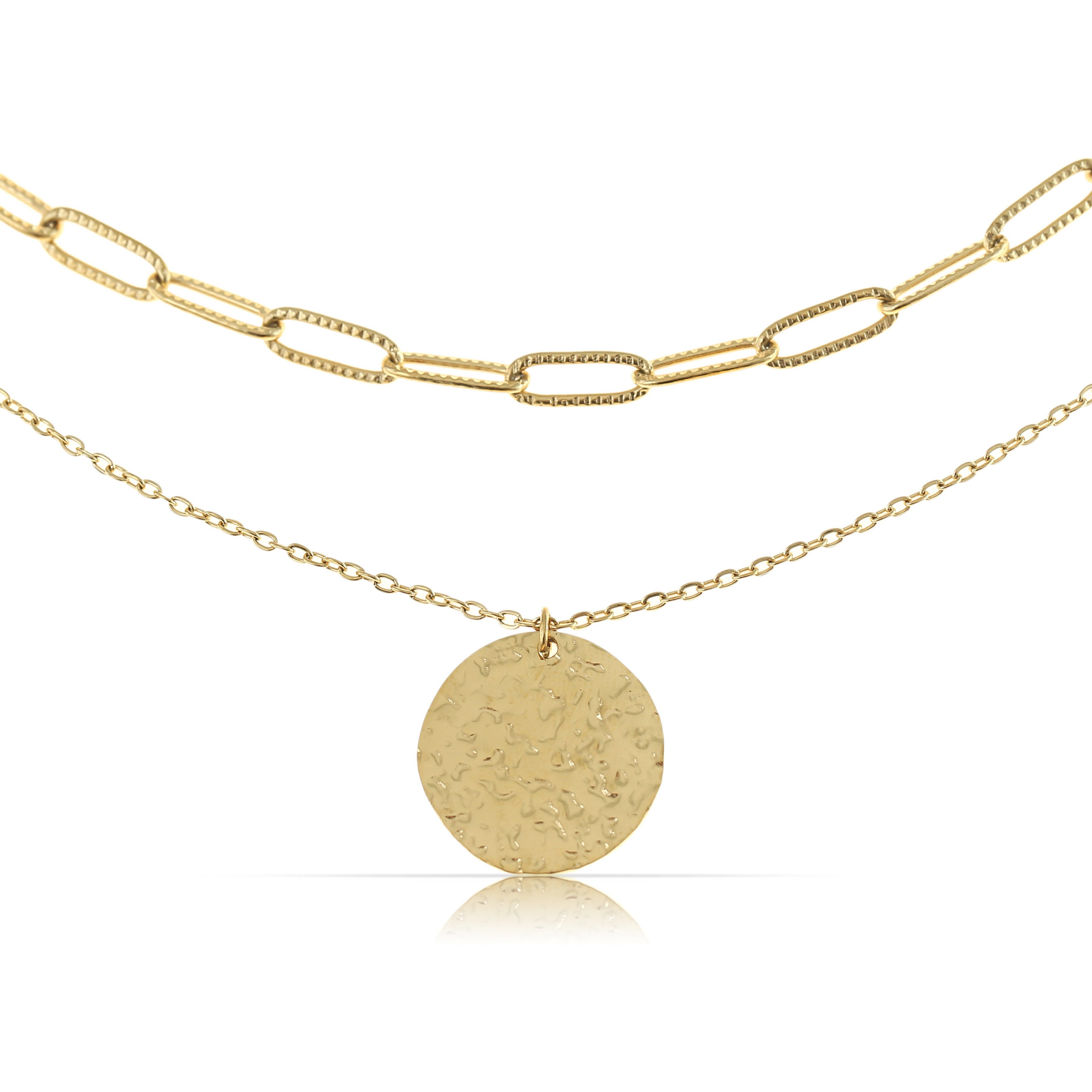Diese zweireihige Halskette für Damen vereint filigrane Glieder mit einem auffälligen Anhänger in gehämmertem Design und setzt stilvolle Akzente. Die harmonische Kombination aus Struktur, Glanz und Kontrast verleiht dem Schmuckstück eine elegante und zugleich charakterstarke Ausstrahlung