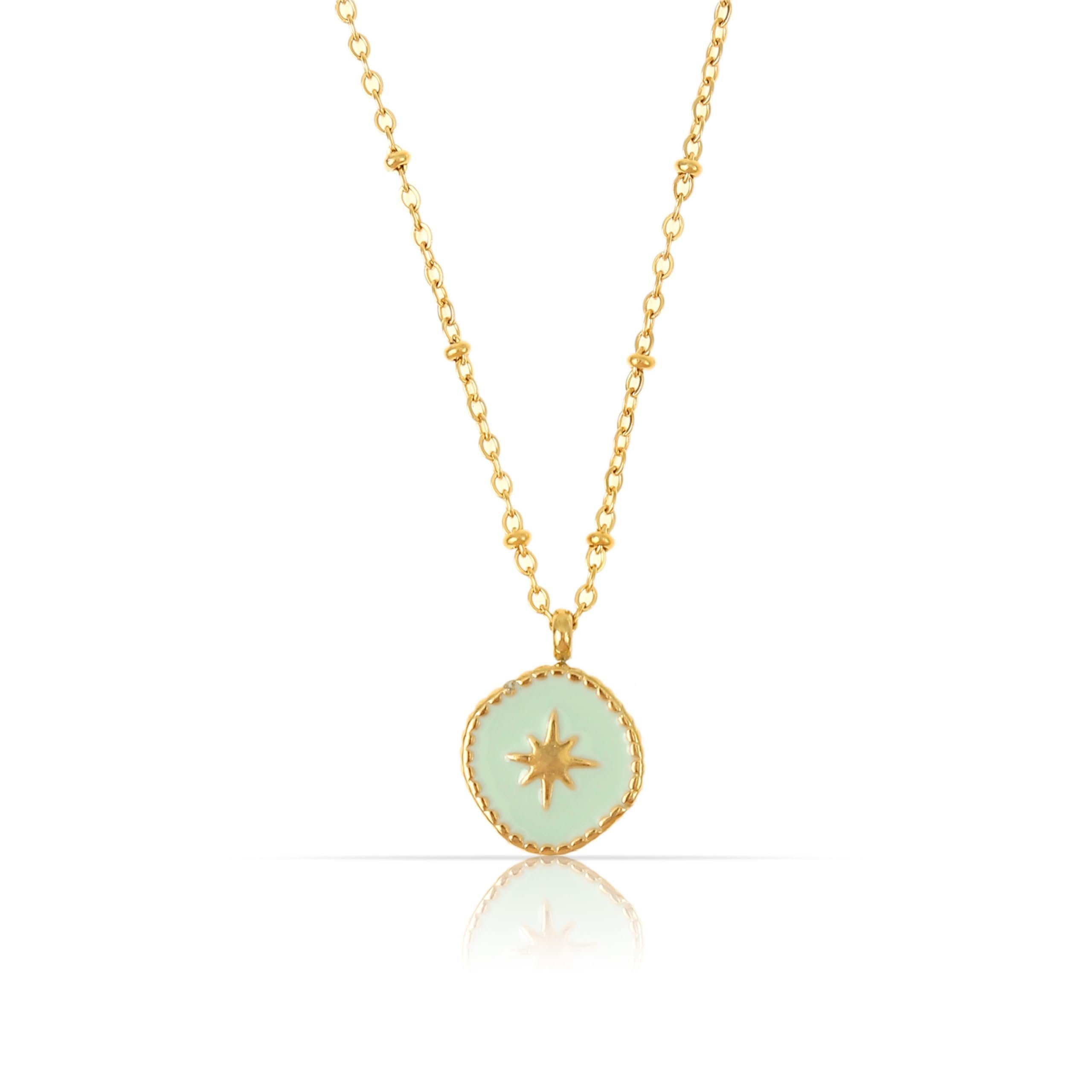 » Unser Damen Schmuck in Gold strahlt durch ihrem exquisiten türkisen Münzanhänger, umrandet von Gold. In der Mitte der Münze prangt ein leuchtender goldener Stern, der diese Kette Gold Damen zu einem echten Blickfang macht. Die Kette mit Anhänger ist ein besondere Freundschaftskette.