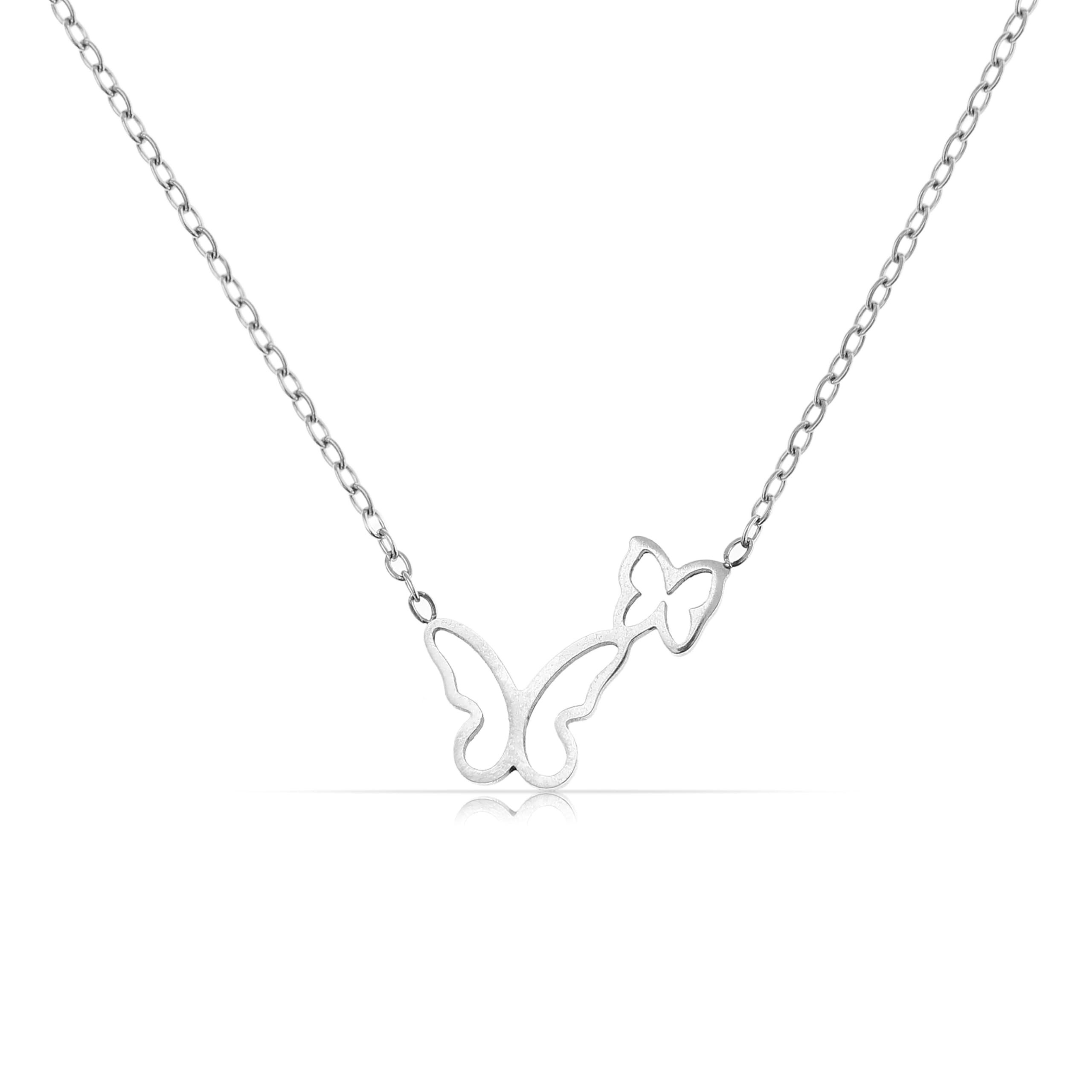 » Der Kettenanhänger Silber sind zwei Schmetterlinge in unterschiedlichen Größen. Die Schmetterlinge der Halskette Silber symbolisieren Freiheit, Liebe und Verbundenheit.