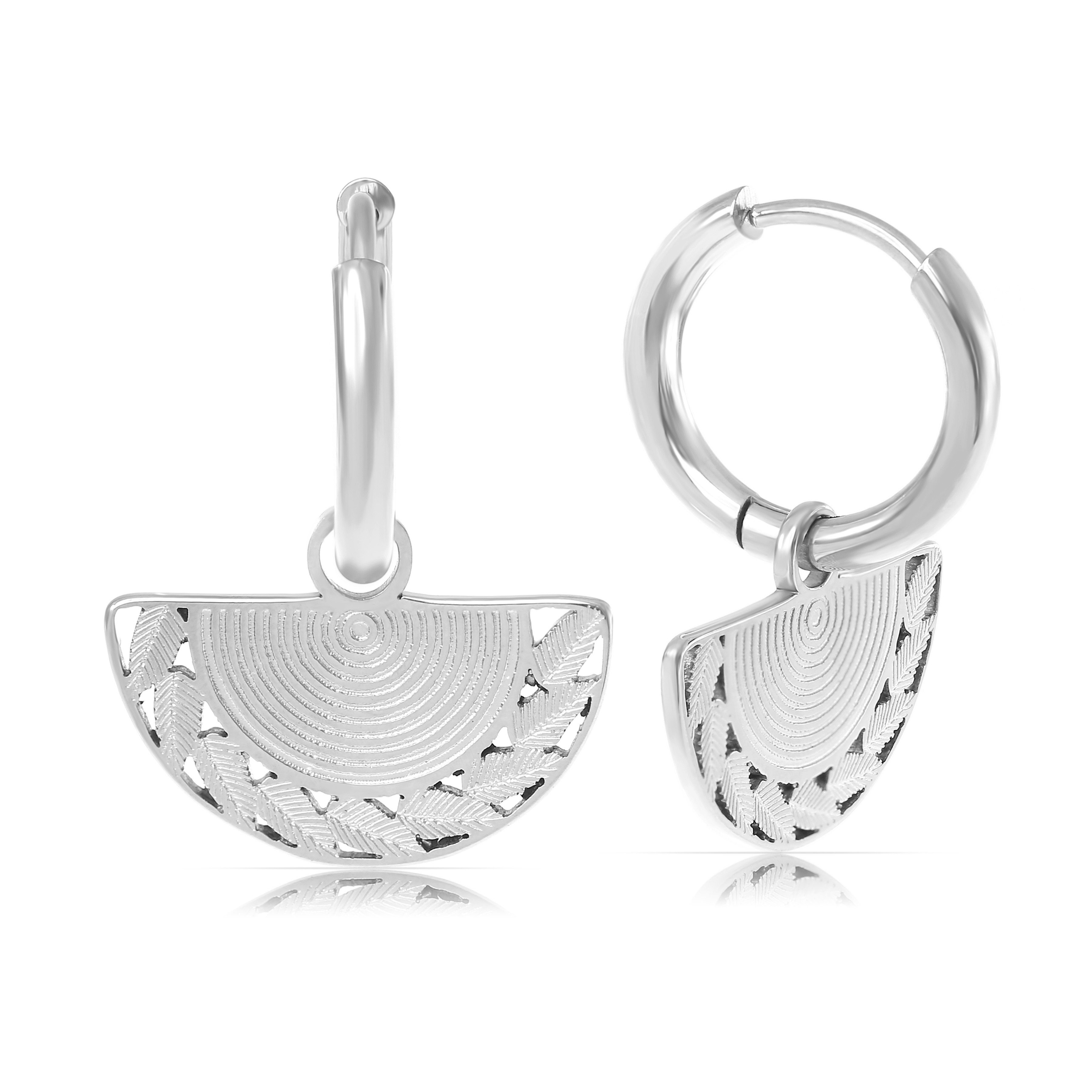 Diese hängenden Damen-Ohrringe vereinen modernes Design mit einem Hauch Ethno-Ästhetik. Der fächerförmige Anhänger in Halbkreisform ist mit feinen Gravuren und geometrischen Mustern verziert, was dem Schmuckstück einen künstlerischen Charakter verleiht. Die Kombination aus klaren Linien und detailreichen Formen schafft einen stilvollen Blickfang für jedes Outfit.
