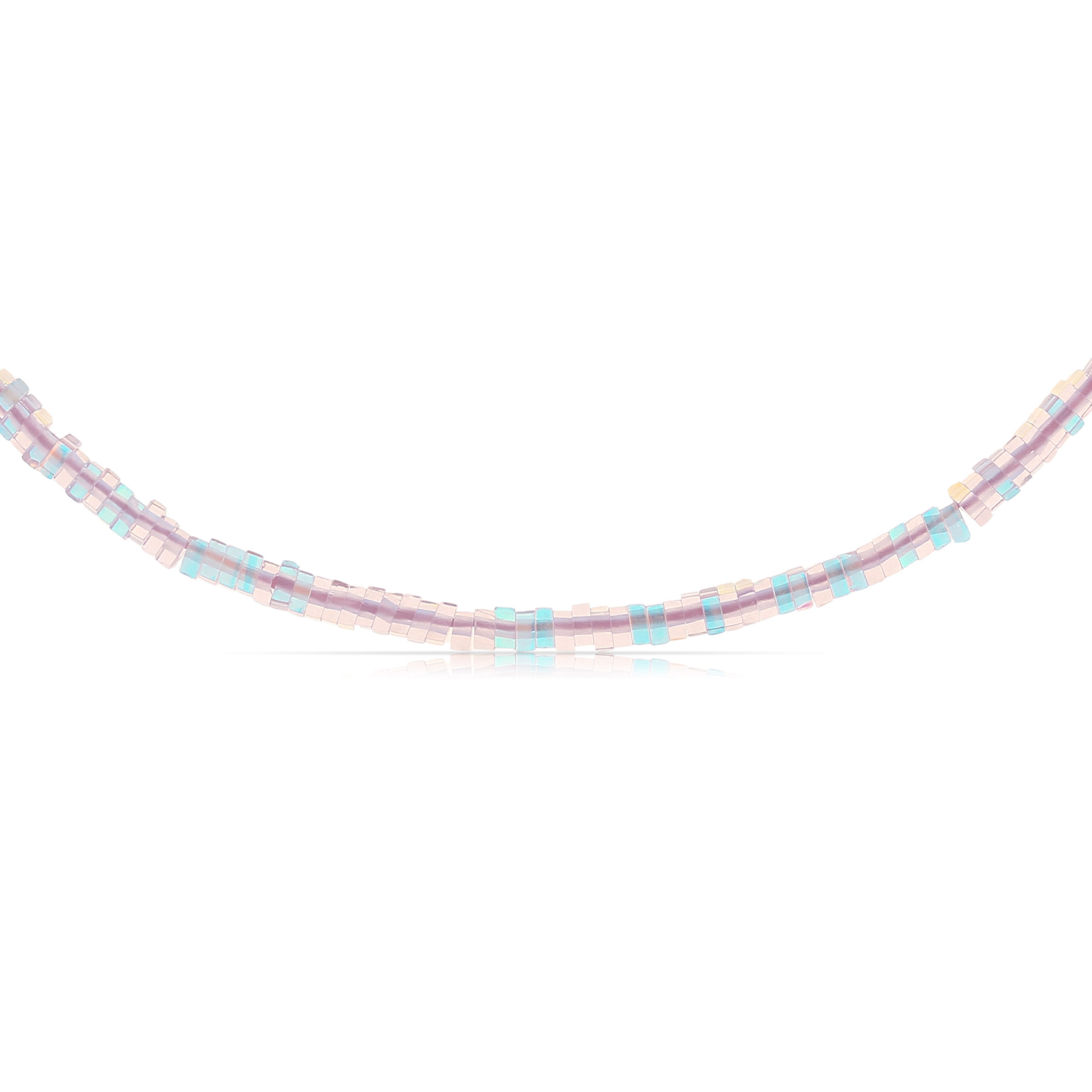 Diese bunte Perlenkette für Damen begeistert durch ihre zarten, quadratischen Perlen in Lila, Blau oder Rot. Der verspielte Farbverlauf und der sanfte Schimmer verleihen der Kette eine frische, sommerliche Leichtigkeit und machen sie zu einem idealen Accessoire für jeden Anlass.