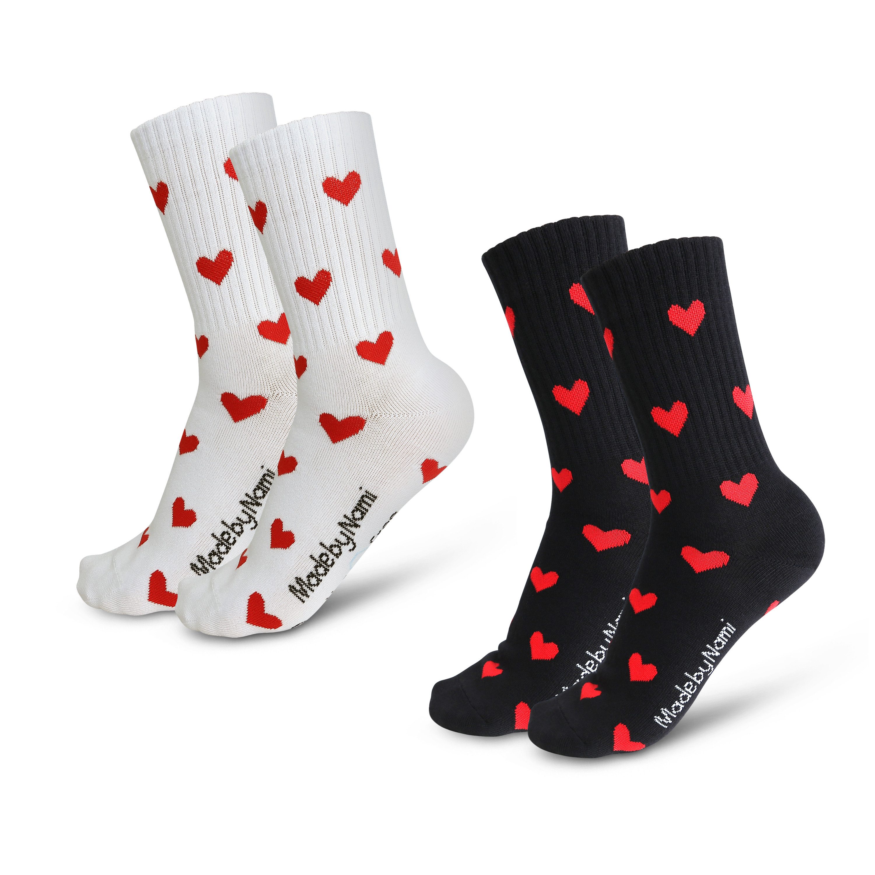 Diese weißen Crew Socken im praktischen 2er Set verbinden modisches Design mit hohem Tragekomfort. Ein stilisiertes Herzmotiv in Schwarz oder Rot verleiht jedem Outfit eine persönliche Note und setzt ein dezentes Statement