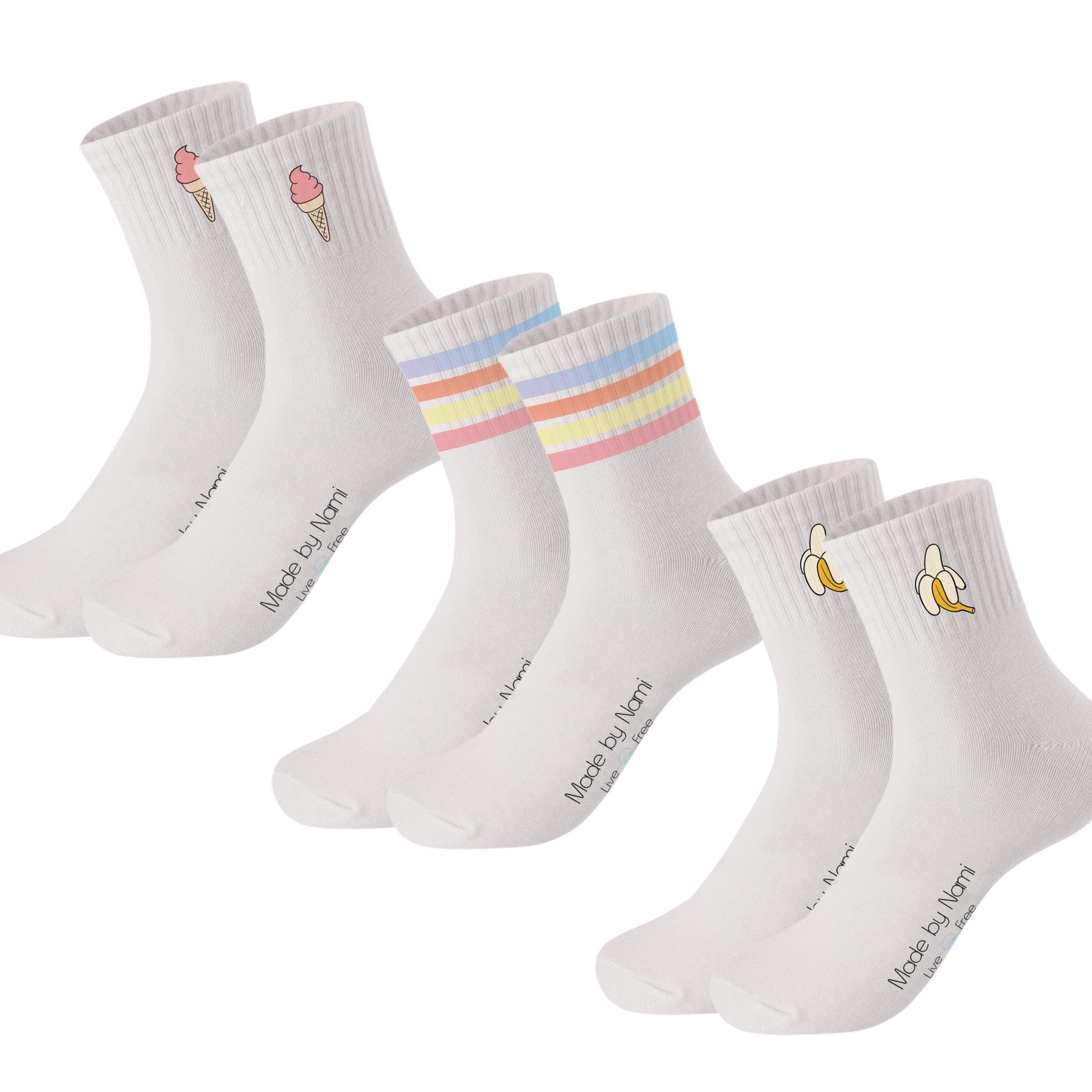 Das Made by Nami Premium Tennissocken Set mit Prints enthält 3 Paar weiße Socken mit Prints. Dank des Pull On Verschlusses erfolgt das An- und Ausziehen der Crew Socks besonders komfortabel.