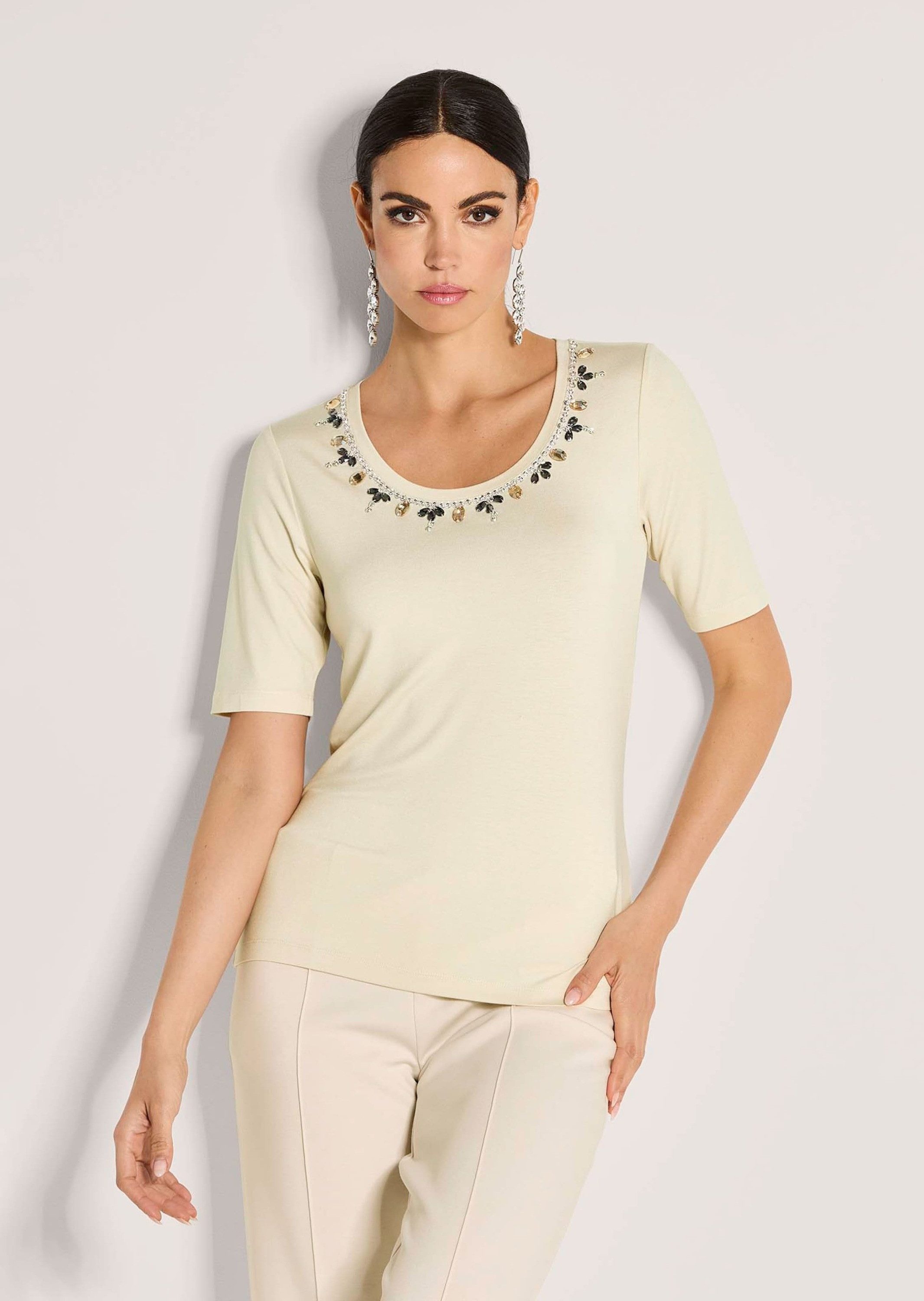 Glanzvolle Akzente bringen Schwung und Raffinesse in den Look. Der klassische Rundhals-Ausschnitt des Shirts wird von zauberhaft funkelnden Schmucksteinen kunstvoll in Szene gesetzt – ein edler Blickfang, der dem Shirt eine exklusive Ausstrahlung verleiht. Weich fließender Viskose-Stretch umschmeichelt sanft die Figur und sorgt dank leicht taillierter Schnittführung für eine schmeichelhafte Silhouette. Das Material liegt angenehm auf der Haut und bietet optimale Bewegungsfreiheit für einen rundum komfortablen Trage-Genuss. Die halblangen Ärmel unterstreichen die moderne, entspannte Eleganz des Shirts und machen es zu einem vielseitigen Begleiter für jede Gelegenheit. Ob stilvoll im Business-Look oder leger in der Freizeit – dieses Shirt schenkt Ihrem Outfit eine feminine verspielte Note und setzt mit glamouröser Zierde ein modisches Statement.
