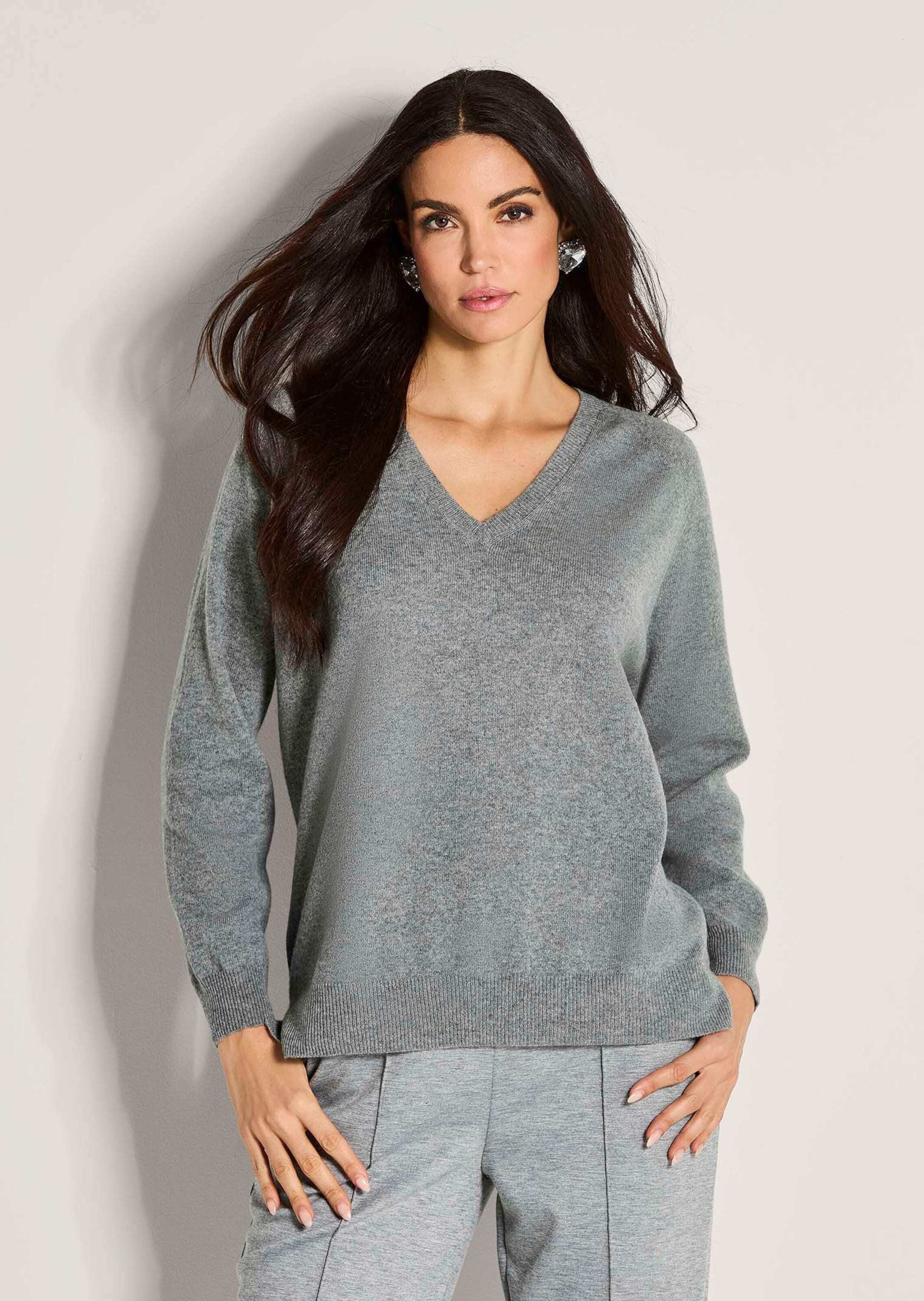 Ein zeitlos eleganter Maschenpartner, der höchsten Tragekomfort bietet. Gefertigt aus reinem, zertifiziertem Good-Cashmere verwöhnt der edle Glattstrick mit unvergleichlich weicher Haptik und lässt Mode zum sinnlichen Erlebnis werden. Die flauschige Qualität schmiegt sich sanft an und verleiht jedem Look eine Aura von schlichter Raffinesse. Der fein geformte V-Ausschnitt bringt feminine Leichtigkeit ins Spiel und setzt das Dekolleté dezent in Szene. Lange Raglanärmel unterstreichen die lässig gepflegte Ausstrahlung. Abschlüsse in formstabilem Rippstrick an Ausschnitt, Ärmeln und Saum sorgen für Kontur und runden das Design mit feiner Struktur ab. Ein Essential für Frauen mit Sinn für Qualität und Understatement – edel, vielseitig und von natürlicher Noblesse.