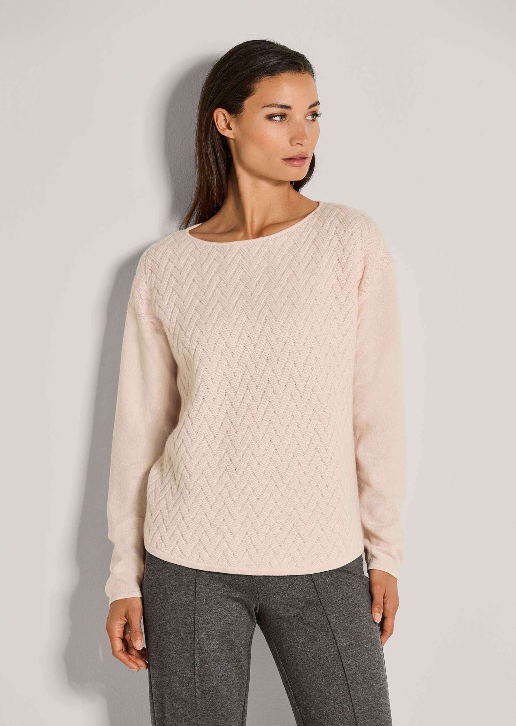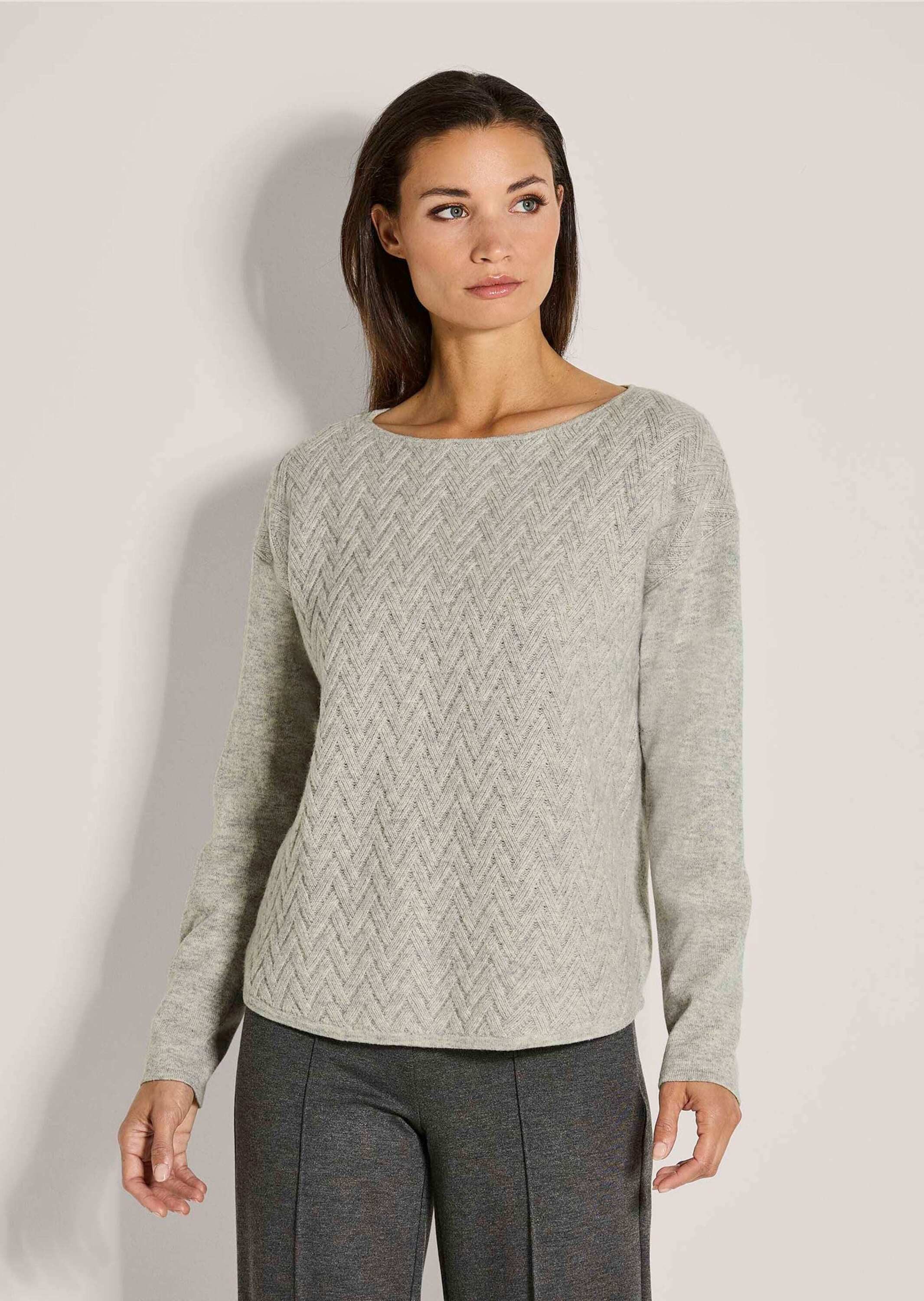 Ein stilvoller Begleiter, der luxuriösen Tragekomfort mit feinsinniger Gestaltung vereint. Die Kombination aus Schurwolle und Kaschmir ist wunderbar flauschig im Griff, während der Schnitt sanft die feminine Silhouette umspielt. Die Vorderseite begeistert mit einem kunstvoll eingestrickten Jacquard-Muster, das dem Modell edle Struktur verleiht. Rückseite und Ärmel sind in glattem Maschenbild gehalten und bilden einen sanften Kontrast zur strukturierten Front. Ein Zusammenspiel aus Ruhe und Eleganz. Der großzügige Rundhals-Ausschnitt wirkt modern und offen, ohne an Finesse zu verlieren. Abschlüsse in formstabilem Rippstrick rahmen Hals, Ärmel und Saum hochwertig ein und garantieren langlebige Passform. Ein edler Strickpartner, der sich mühelos in jede anspruchsvolle Garderobe einfügt. Vielseitig kombinierbar, geschmackvoll im Ausdruck und ideal für viele Gelegenheiten.