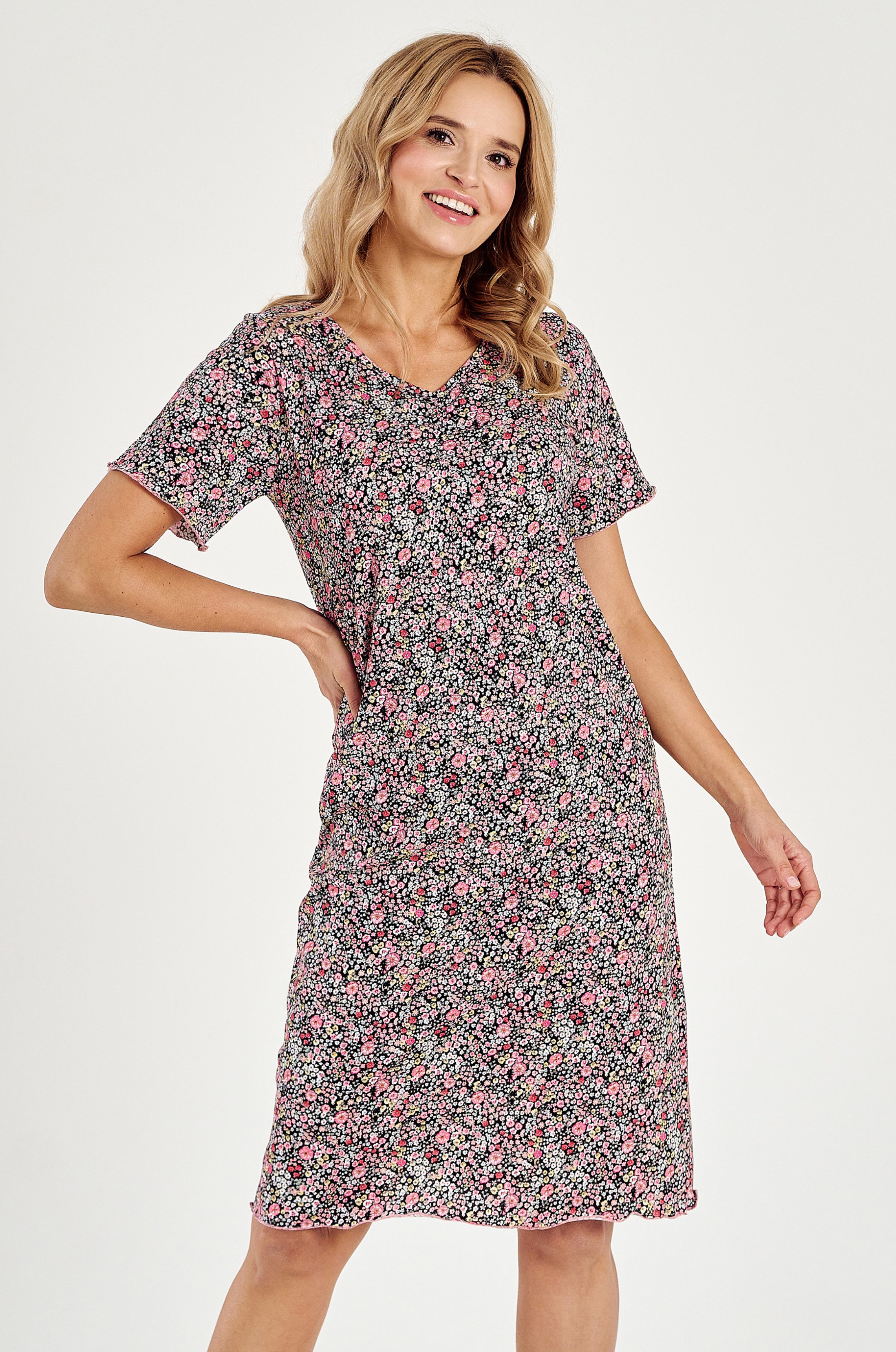 Schlafkomfort: Erleben Sie mit unserem Nachthemd aus 100% Baumwolle Komfort und Stil. Knielanges Design mit V-Ausschnitt und kurzen Ärmeln, mit einem farbenfrohen Blumendruck.