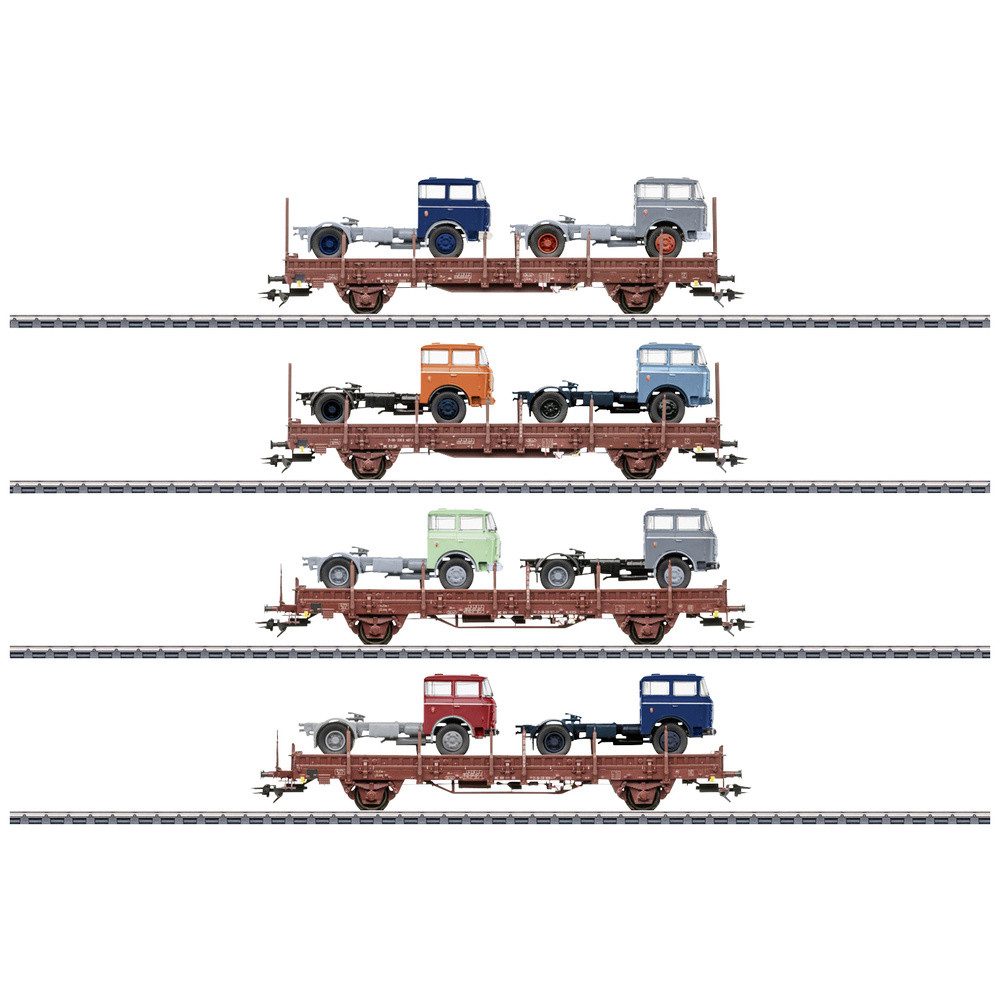 Modell: Все Wagen mit separat angesetzten Bremsanlagen, Bremsbedienelementen und drehbaren Rungen. Je eine Runge auf jeder Wagenseite ist mit der Betriebsnummer des Wagens bedruckt. Ladefläche in Holzbohlenoptik. Stirnseitige Aufnahmen zum Einstecken von beiliegenden Rungen. Pufferhöhe nach NEM. Ks 3300 mit separat angesetztem Unterzug und in Ausführung ohne Bremserbühne sowie langen Stirnrungen. Rechteckige Pufferteller. Ks 3301 mit separat angesetztem Sprengwerk und in Ausführung mit stirnseitiger Handbremsbühne sowie kurzen Stirnrungen. Runde Pufferteller. Pufferhöhe nach NEM. Все Wagen mit je zwei Zugmaschinen vom Typ Skoda LIAZ 706 beladen. Haltekeile und Stirnrungen liegen bei. Modelle der Zugmaschinen von der Firma Brekina. Gesamtlänge über Puffer ca. 65 cm. Gleichstromradsatz E700580. Passende Zuglokomotiven finden Sie unter den Artikelnummern 39200 und 39202