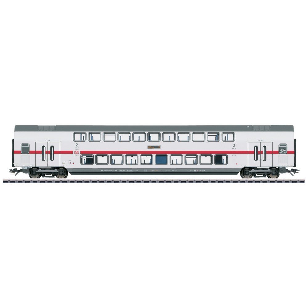 Vorbild: IC2 Doppelstock-Mittelwagen DBpza 682.2, 2. Klasse, der Deutschen Bahn AG (DB AG) für den Fernverkehr. Lichtgraue Fernverkehrs-Farbgebung mit verkehrsrotem Zierstreifen, im aktuellen IC-Design. Zuglauf: IC 2045 von Köln nach Dresden Hbf. Wagen-Ordnungsnummer 3. Betriebszustand 2020. Modell: Befahrbarer Mindestradius 360 mm. Mit Hoch-Einstieg über den Drehgestellen. Serienmäßig mit eingebauter LED-Innenbeleuchtung auf beiden Ebenen und stromführenden, trennbaren Kurzkupplungen. Beleuchtete längsseitige ZugzielОтзывы. Innenbeleuchtung funktioniert nur im Verbund mit dem Doppelstock-Steuerwagen und kann über einen Decoder im Steuerwagen digital ein- und ausgeschaltet werden. Dazu ist eine definierte Fahrzeugreihenfolge vorgegeben. Stirnseitig rot transparente Schlusslicht-Einsätze an den Wagenenden. Vorbildgerechte Drehgestelle der Bauart Görlitz, mit angesetzten Klapptrittstufen. Длина über Puffer 28,6 cm. Die passende Elektrolokomotive der Baureihe 146.5 finden Sie ebenfalls im Märklin H0-Меню unter der Artikelnummer 37449, zur Bildung einer vorbildgerechten 6-teiligen Zugeinheit mit den Doppelstockwagen 43486, 43487, 43488, 43489 und 43490.Ein Befahren von gebogenen Rampenstücken ist gegebenenfalls nur nach entsprechender Modifikation dieser Auffahrten möglich. Dieses Modell finden Sie in Gleichstromausführung im Trix H0-Меню unter der Artikelnummer 23256