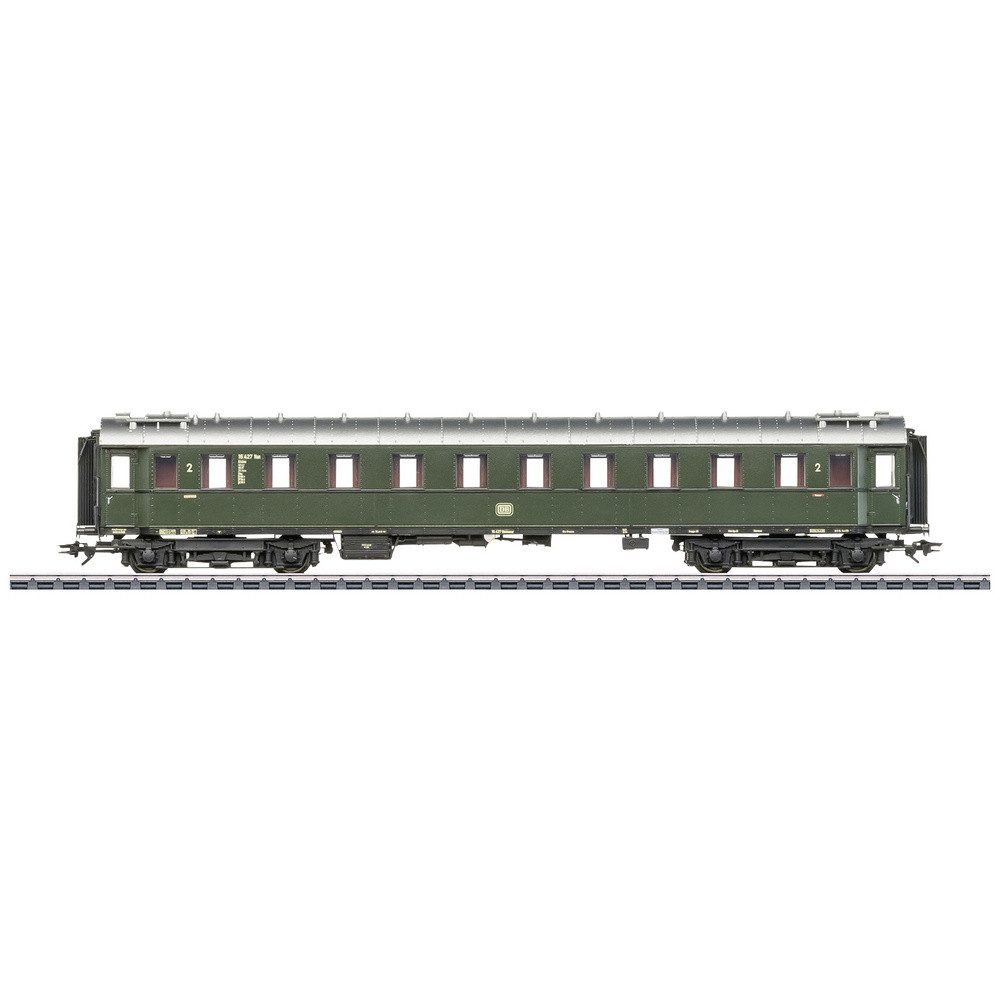 Vorbild: Vierachsiger Schnellzugwagen B4üwe, 2. Klasse (Einheitsbauart 1928 bis 1930) der Deutschen Bundesbahn (DB). Flaschengrüne Grundfarbgebung. Mit Tonnendach, stirnseitigen Aufstiegsleitern und Faltenbalg-Übergängen. Betriebszustand der Epoche IIIb.