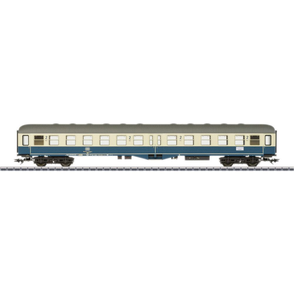 Vorbild: Reisezugwagen 2. Klasse der Deutschen Bundesbahn (DB) für sogenannte leichte Schnellzüge (LS). Bauart Bylb 421. Umgangssprachlich auch als „Mitteleinstiegswagen“ bekannt. Ausführung mit stirnseitig oben liegenden kleinen Schlussleuchten und einteiligen Fenstern an den Einstiegen am Wagenende. Farbgebung in Ozeanblau/Elfenbein. Betriebszustand um 1980.
