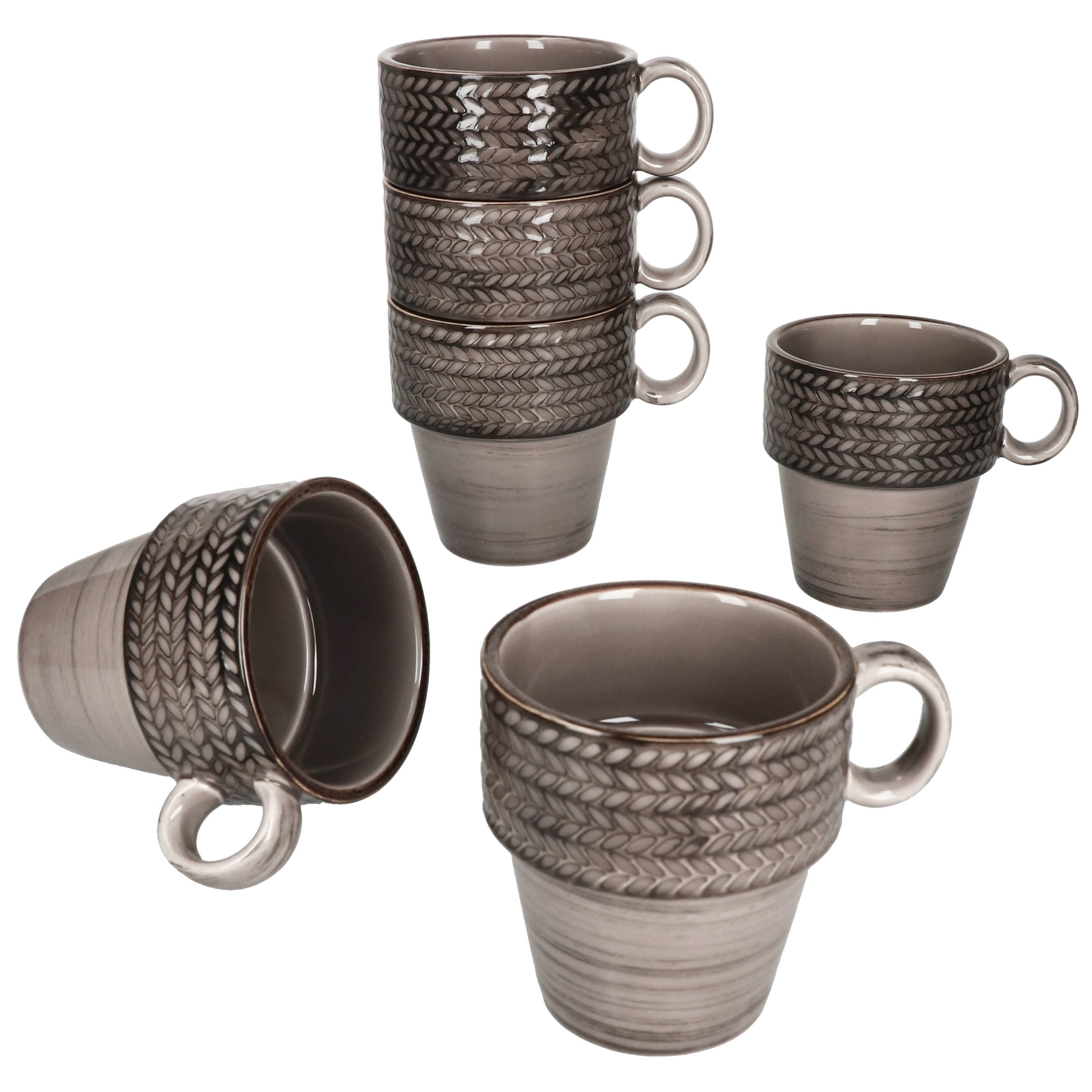 Die runden konischen Kaffeebecher sind in einem dunklen Braunton gehalten und verzaubern durch das aufeinander abgestimmte Retro-Design. Die Innenseite sowie die untere äußere Seite sind mit einem handgepinseltem Spiraldekor versehen. Der obere Teil ist außen erhaben und umlaufend mit einem fühlbaren Reliefmuster versehen, welches von einer unregelmäßig schimmernden ockerfarbenen Umrandung vollendet wird. Durch die praktische Form sind diese auch stapelbar und sparen daher eine Menge Platz in der Küche. Das Design ist bei jedem Becher einzigartig und daher ist jedes Geschirrteil ein Unikat.