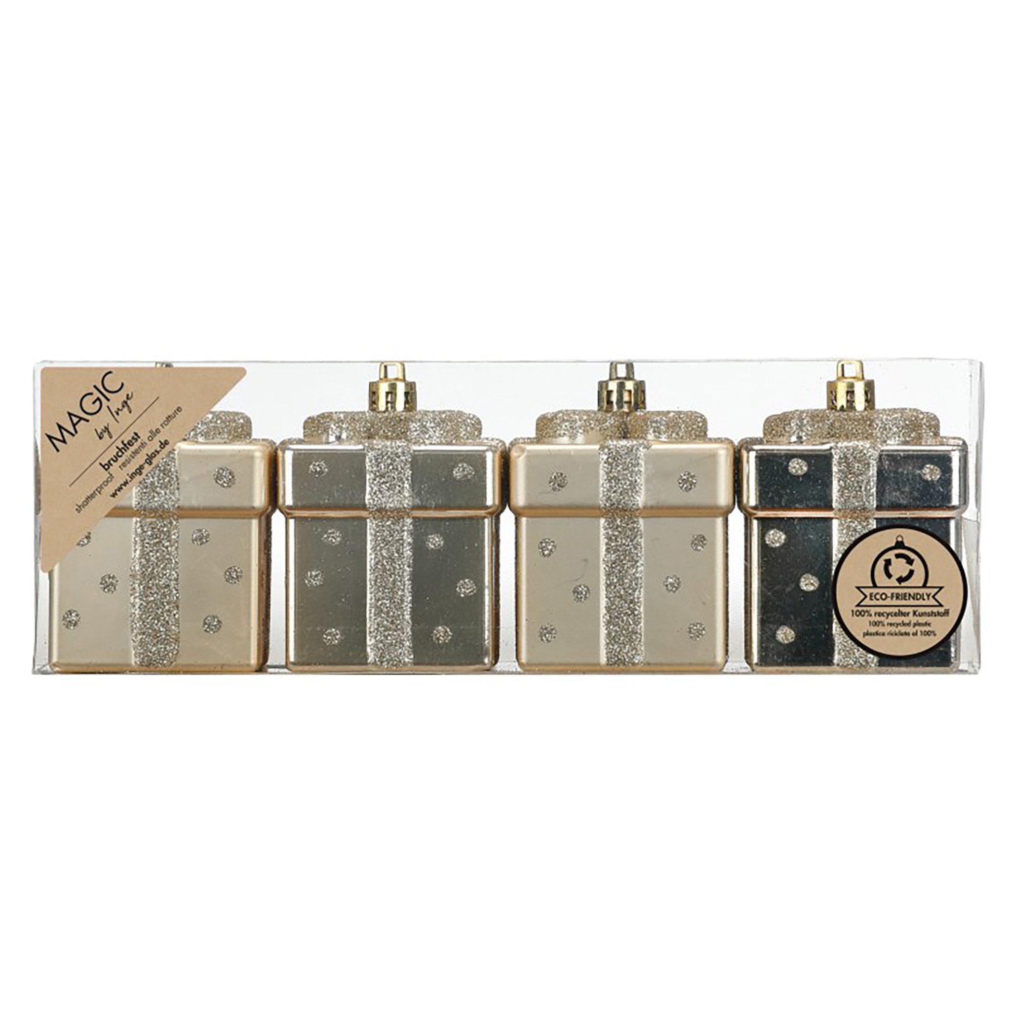 Weihnachtskugeln / Christbaumkugeln / Weihnachtsbaumschmuck / Christbaumschmuck - Geschenkboxen Material: Kunststoff - Plastik Размер (LxBxH): ca. 5,5 x 5,5 x 6,5 cm Packungsinhalt: 4 Anhänger Farbton: champagner - hellgold Farbserie Creamy Gold: Champagner ist eine raffinierte und zeitlose Farbe, die an sprudelnden Luxus und feierliche Anlässe erinnert. Mit seinen zarten Nuancen von Gold und Beige verleiht es jedem Raum eine elegante und edle Atmosphäre. - schöne Weihnachtsbaumanhänger, bruchsicher - einfarbig, mit Glitzer, matt und glänzend gemischt Setzen Sie Ihren Christbaum mit diesen Weihnachtsbaumkugeln in Szene. Die Tannenbaumkugeln sind vielseitig einsetzbar, sei es als klassischer Christbaumschmuck, Weihnachtsanhänger oder als Tischdekoration. Kunststoffkugeln sind eine hervorragende Alternative zu Glaskugeln, da kein Risiko von Glasbruch besteht, was sie praktisch und sicher macht. Somit eignet sich der bruchfeste Baumbehang ideal für Familien mit Kindern und Haustieren. Ob als traditioneller oder moderner Tannenbaumschmuck, diese Baumkugeln lassen sich hervorragend mit anderen Christbaumanhängern, Figuren und Weihnachtsschmuck kombinieren. Die Plastikkugeln sind einfach zu befestigen und eignen sich perfekt, um den Tannenbaum oder die Festtagstafel zu verschönern. Die Weihnachtsbaum Deko ist auch eine wunderbare Geschenkidee für Freunde, Familie oder Kollegen zu Weihnachten. Überraschen Sie Ihre Liebsten mit diesem schönen Baumschmuck als Weihnachtsgeschenk. Form & Figur: Geschenkbox, Geschenkboxen, Geschenkschachtel, Weihnachtsgeschenke, Deko Geschenkpäckchen, Geschenke Muster & Motiv: Punkte, Pünktchen, Polka Dots, mit Punkten / Punktemuster, gepunktet, gemustert Stil & Aufmachung: uni & einfarbig Farbgruppe: creme - beige - pastell - pastellfarben - gold - goldfarben Die Farben können aufgrund von unterschiedlichen Monitor Einstellungen vom Foto leicht abweichen